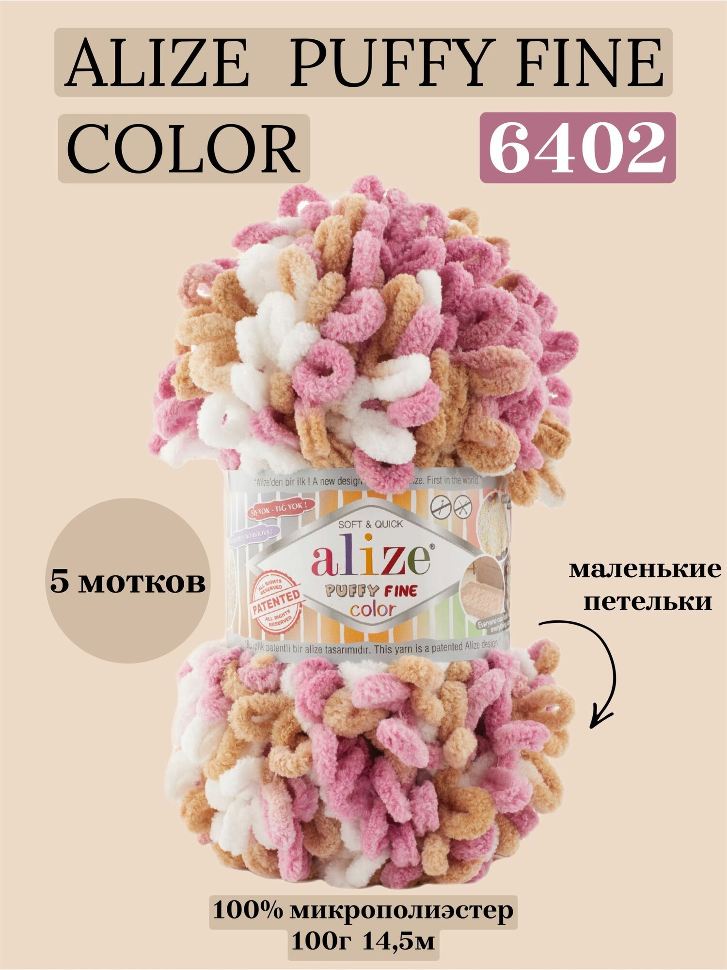 СохранитьПряжа для вязания плюшевая Alize Puffy Fine Color, цвет 6402, 100г, 14,5м, 5 шт/упак интересное: