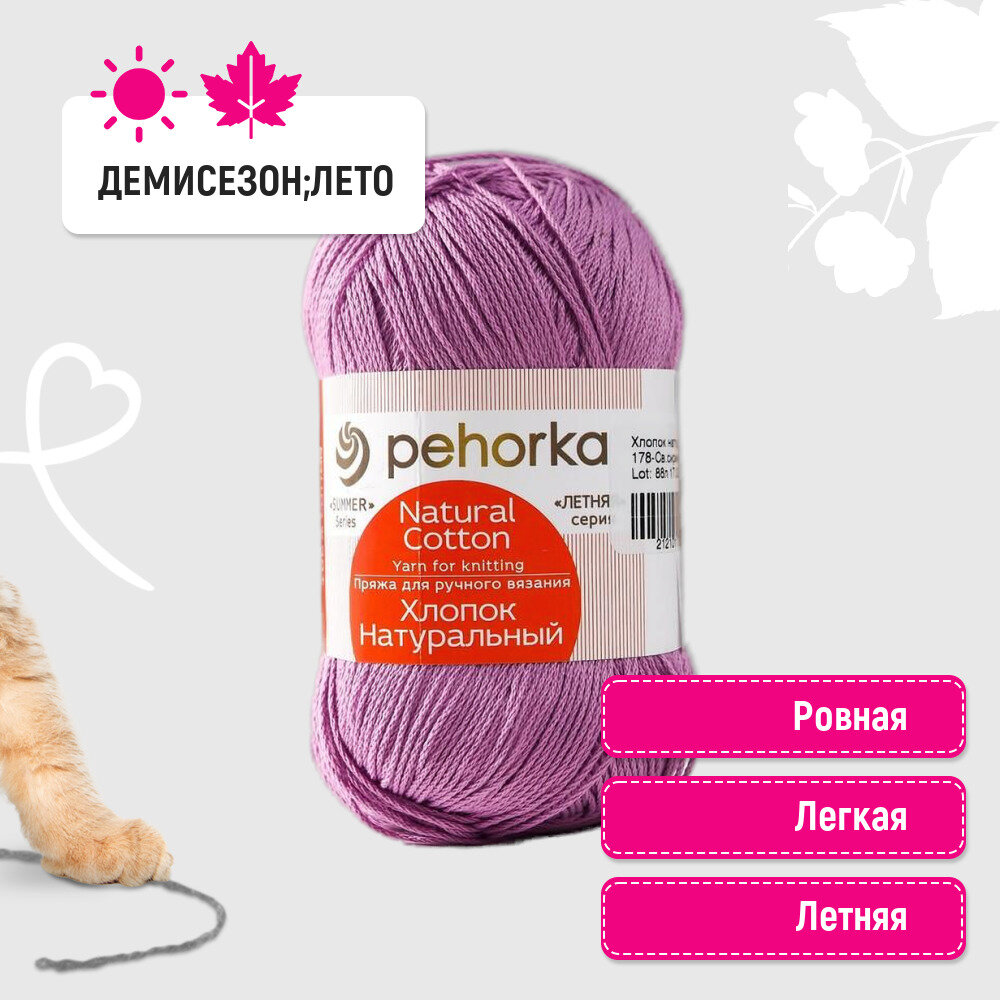 Пряжа Пехорка Хлопок натуральный светло-сиреневый (178), 100%хлопок, 425м, 100г, 2шт