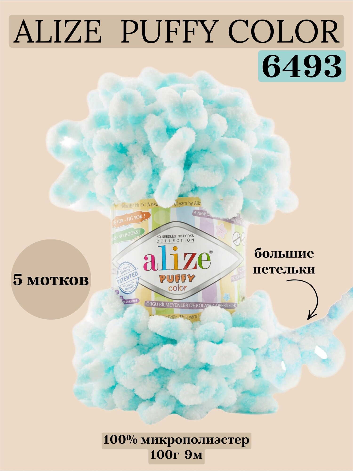 СохранитьПряжа Alize Puffy color белый/светло-бирюзовый (6493), 100%микрополиэстер, 9м, 100г, 5шт интересное: