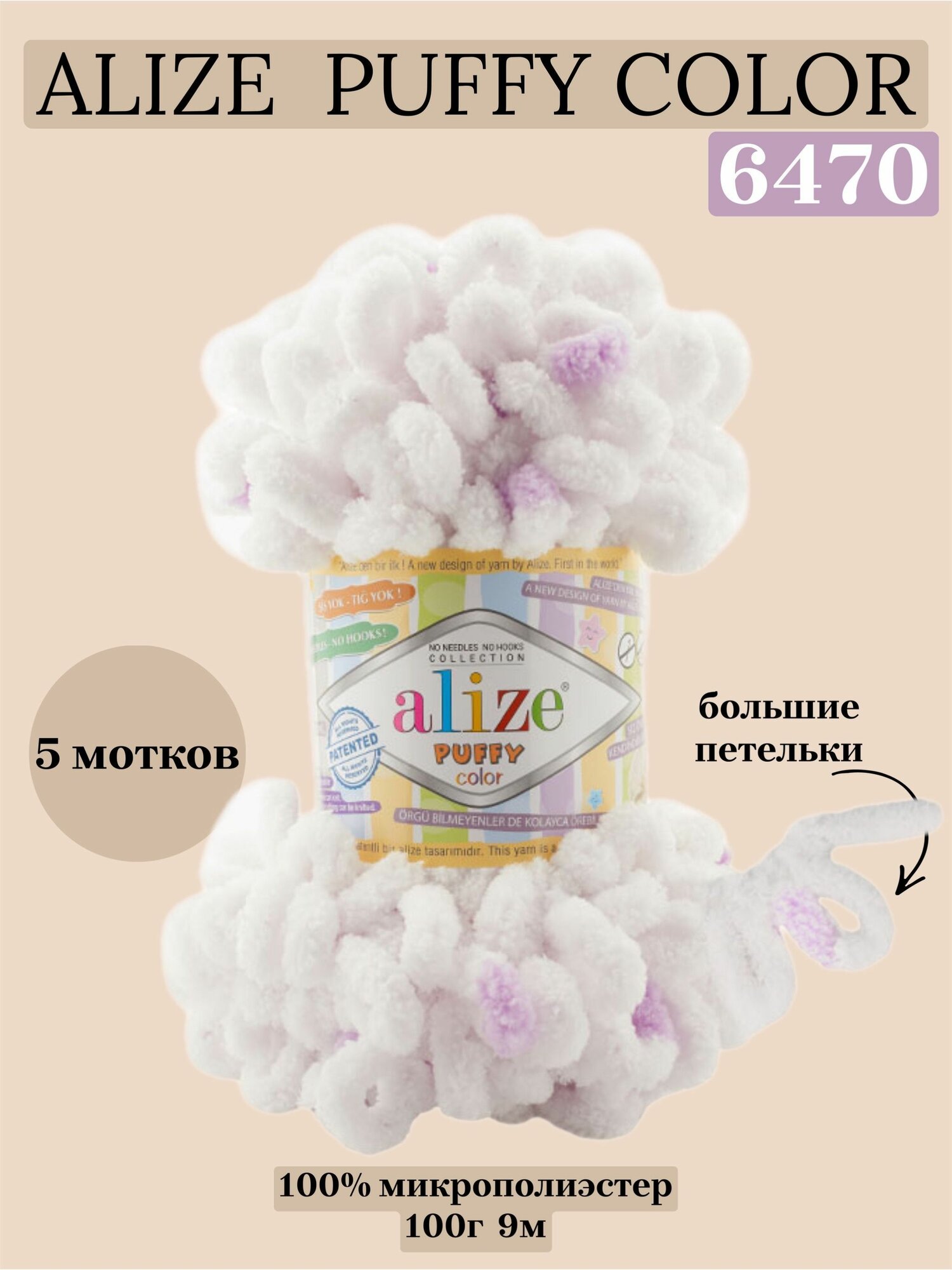 Пряжа ALIZE "Puffy Color", 100 г 9 м, 100% микрополиэстер, 6470 секционный, 5 шт