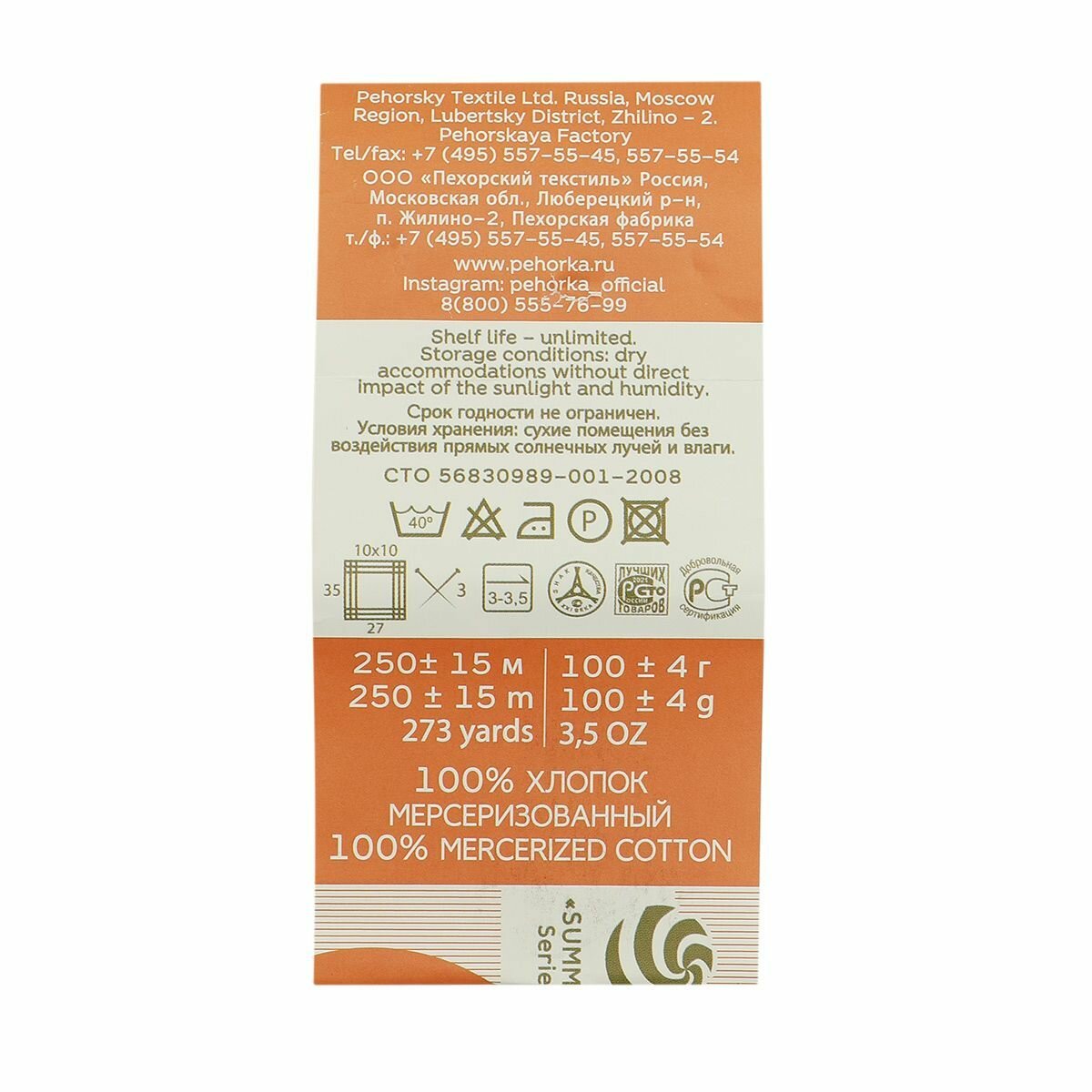 Пряжа Пехорка Весенняя морковь (285), 100%мерсеризованный хлопок, 250м, 100г, 1шт