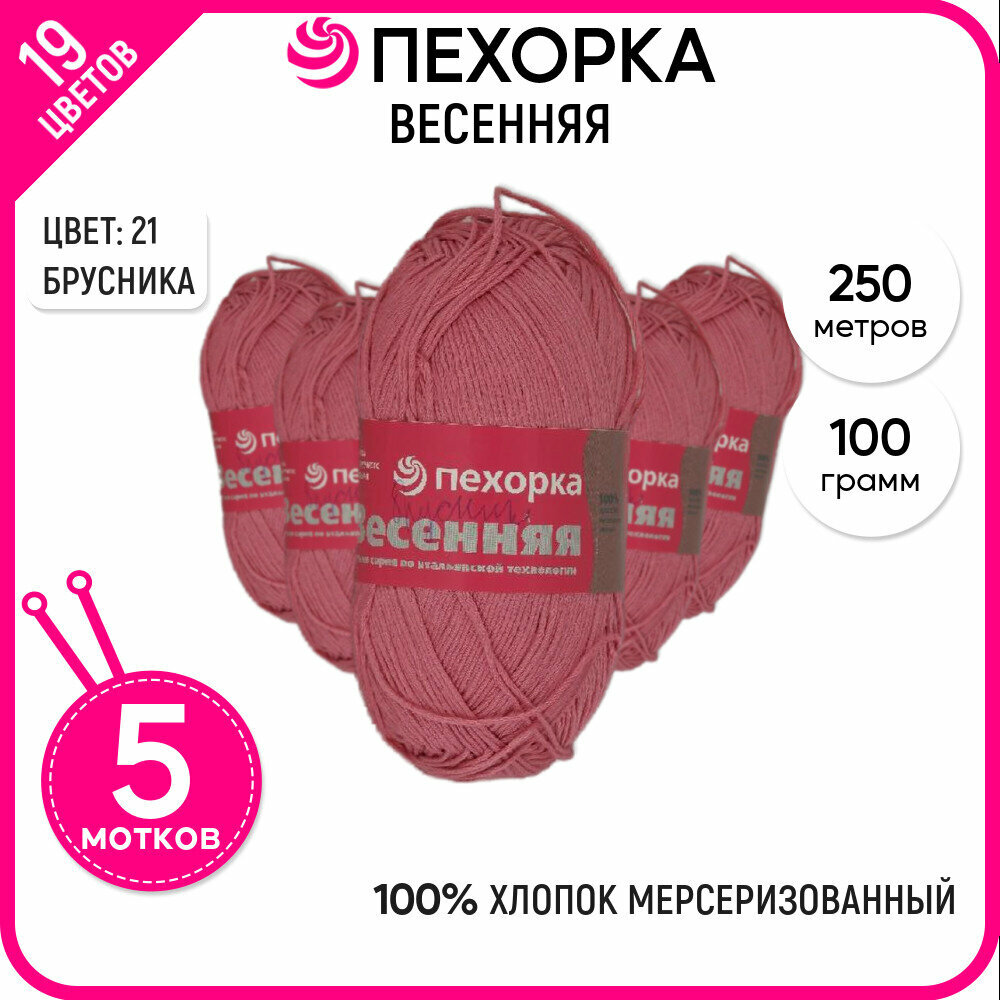 Пряжа для вязания Пехорка 'Весенняя' 100г, 250м (100% мерсеризованный хлопок) (21-Брусника), 5 мотков