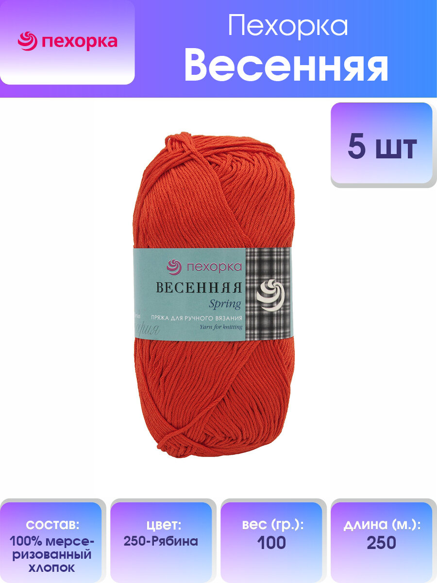 Пряжа Весенняя (Пехорка), Рябина - 250, 100% мерсеризованный хлопок, 5 мотков, 100 г, 250 м.