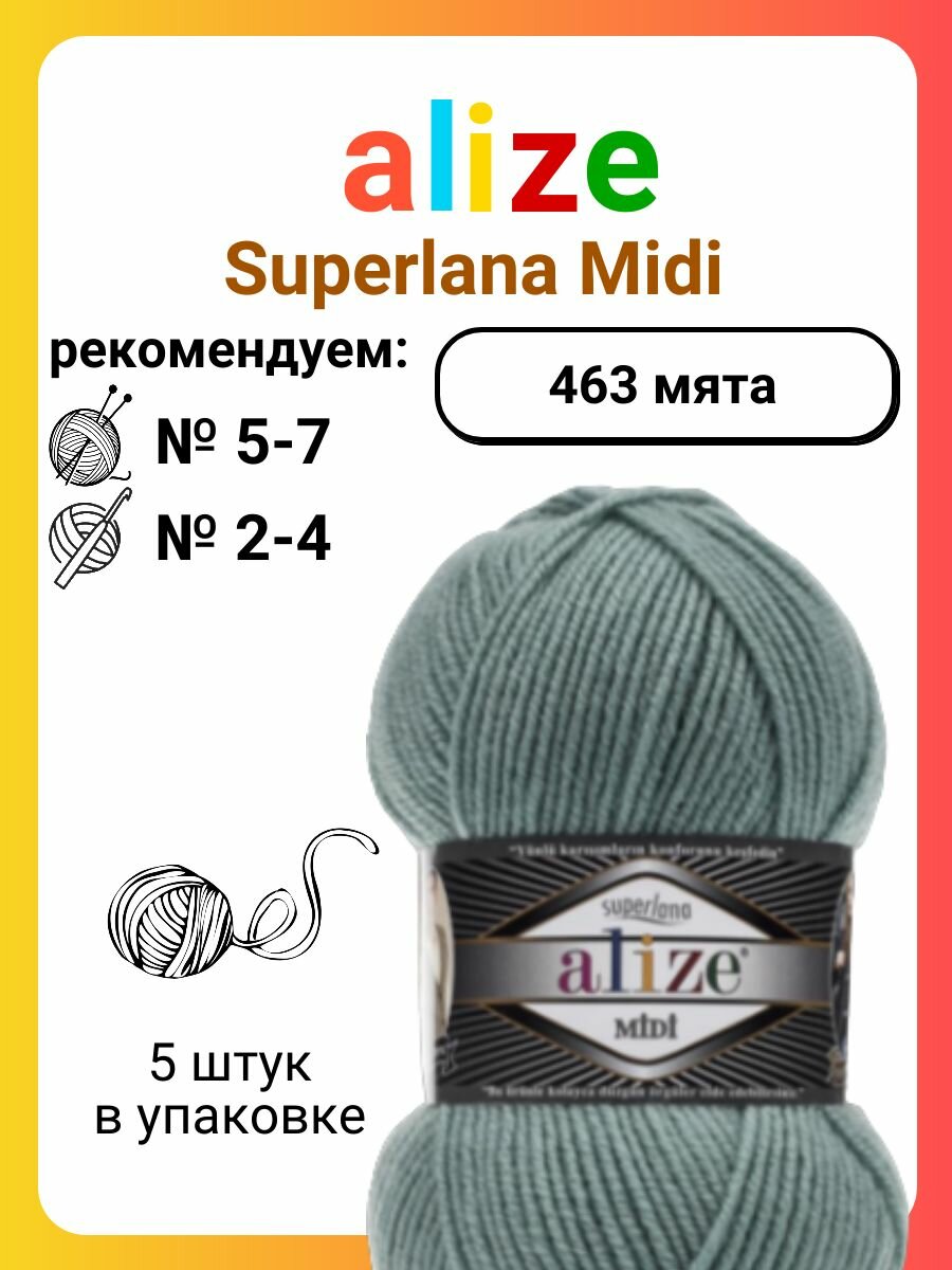 Пряжа ALIZE SUPERLANA MIDI, мята - 463, 25% шерсть, 75% акрил, 5 мотков, 100 г, 170 м.