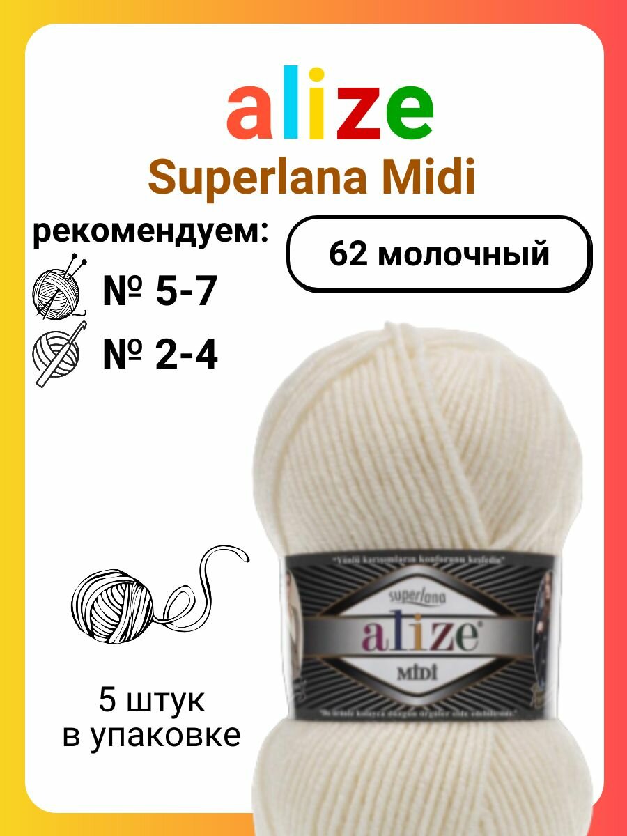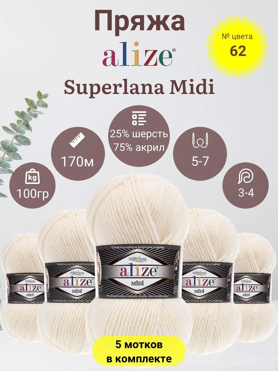 Пряжа ALIZE SUPERLANA MIDI, молочный - 62, 25% шерсть, 75% акрил, 5 мотков, 100 г, 170 м.