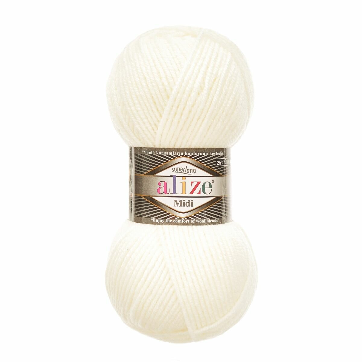 Пряжа Alize Superlana Midi светло-молочный (62), 25%шерсть/75%акрил, 170м, 100г, 2шт