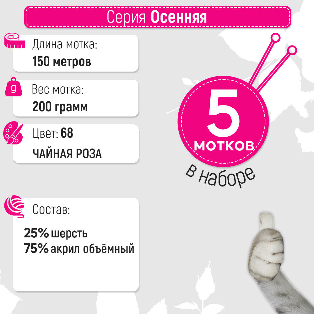 Пряжа Осенняя (Пехорка), Чайная роза - 68, 25% шерсть, 75% акрил, 5 мотков, 200 г, 150 м.