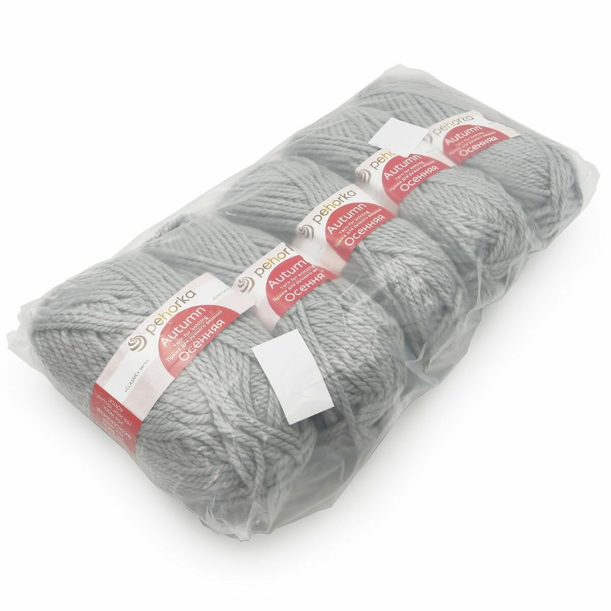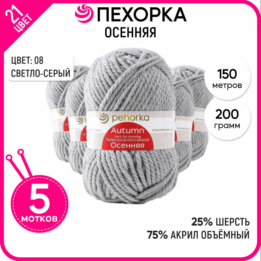 Пряжа Пехорка Осенняя цвет 08 светло-серый (200г/150м, упаковка 5 мотков)