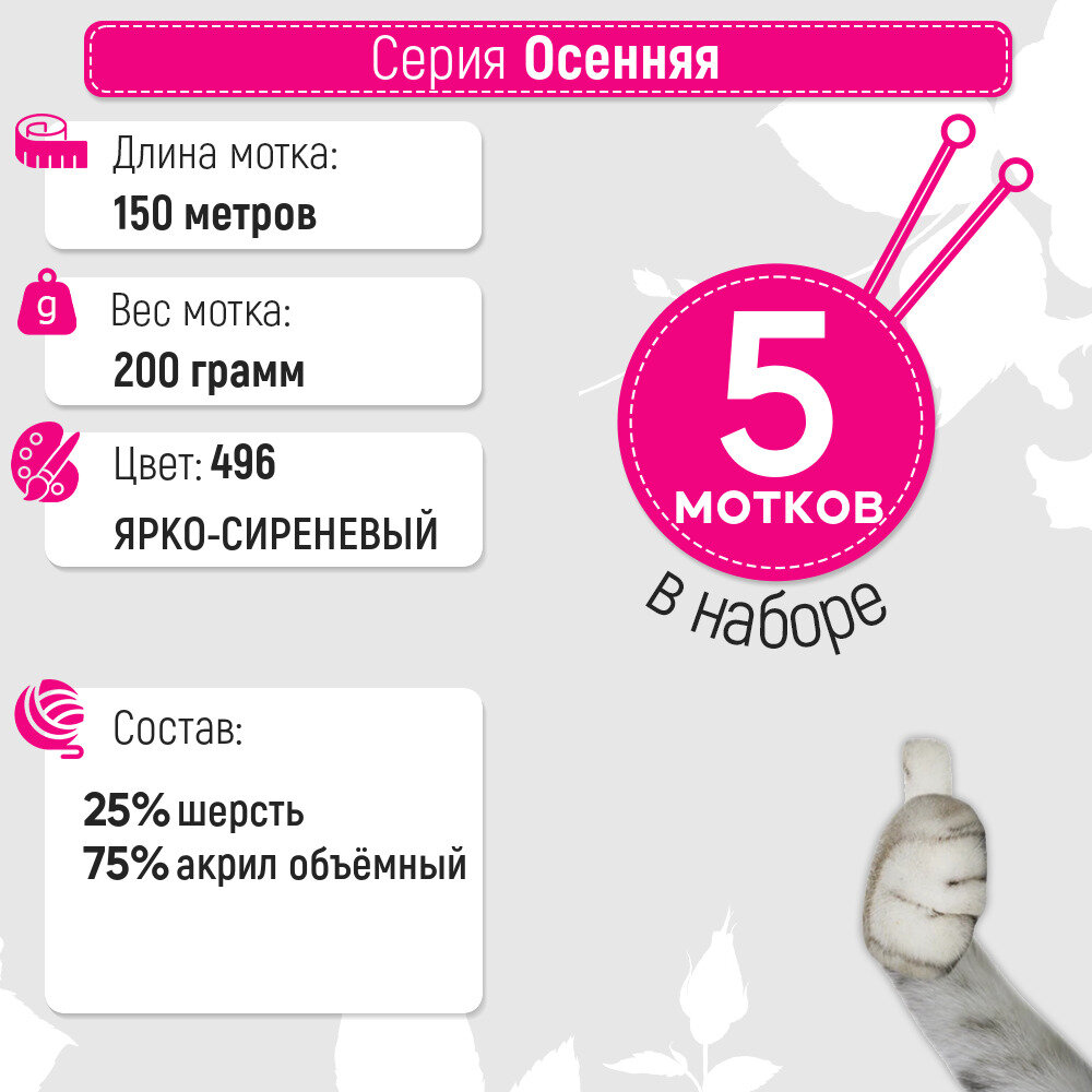 Пряжа Пехорка Осенняя цвет 496 яркая сирень (200г/150м, упаковка 5 мотков)
