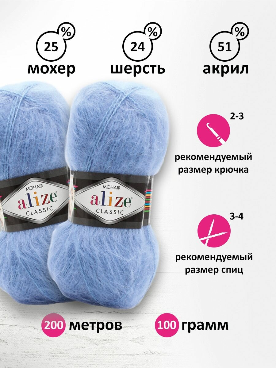 Пряжа для вязания ALIZE Mohair Classic: 40 (голубой), 3 шт 200 м 100 г, 25% мохер 24% шерсть 51% акрил