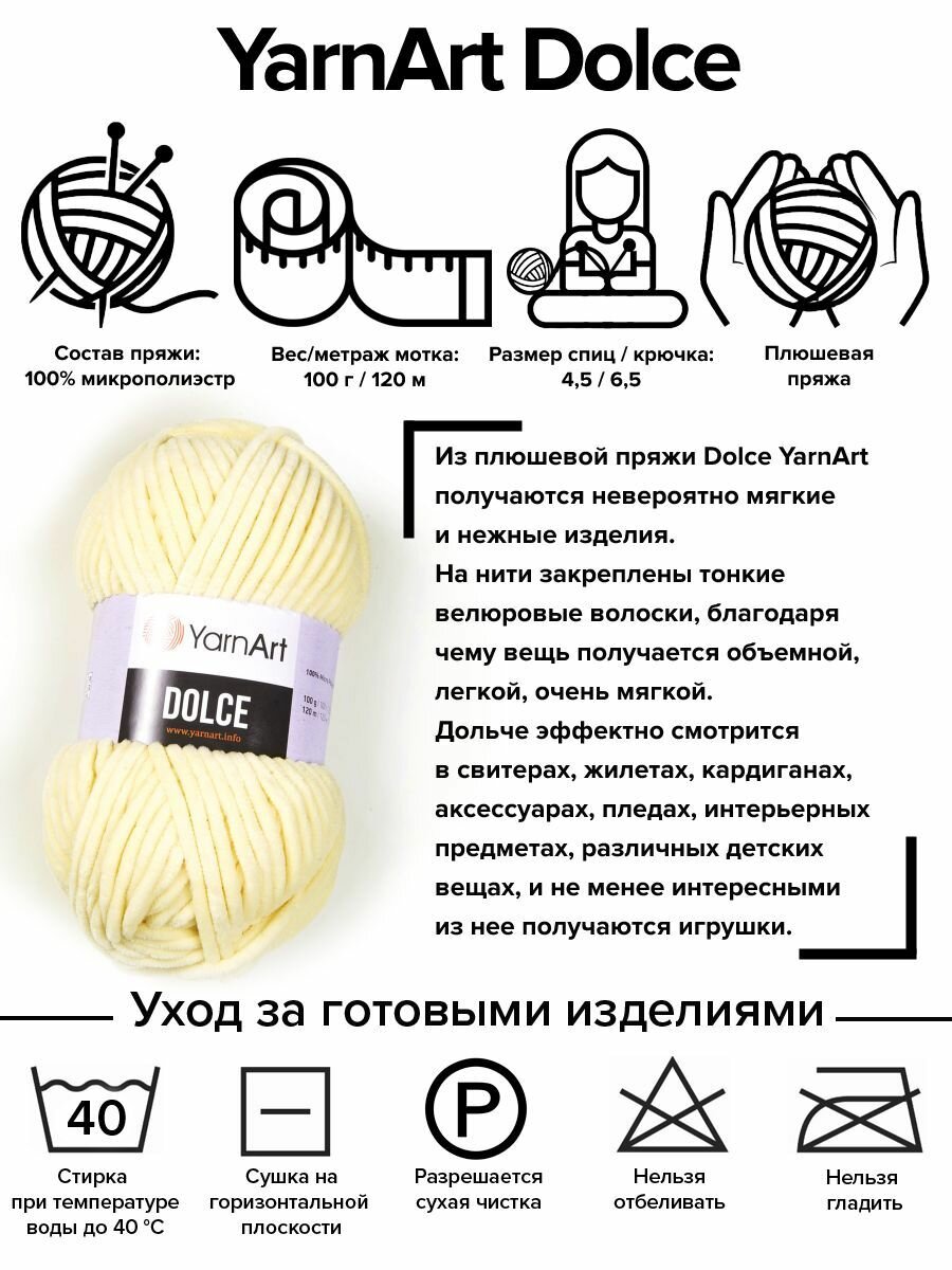 Ниже Вы можете прочитать отзывы на Пряжа для вязания YarnArt 'Dolce' 100г, 120м (100% микрополиэстер) (783 молочный), 5 мотков, ознакомится с подробными характеристиками, посмотреть интересные обзоры и фотографии на Пряжа для вязания YarnArt 'Dolce' 100г, 120м (100% микрополиэстер) (783 молочный), 5 мотков.