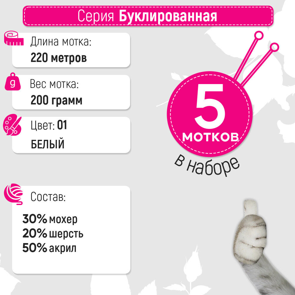 Пряжа Пехорка Буклированная цвет 01 белый (200г/220м, упаковка 5 мотков)