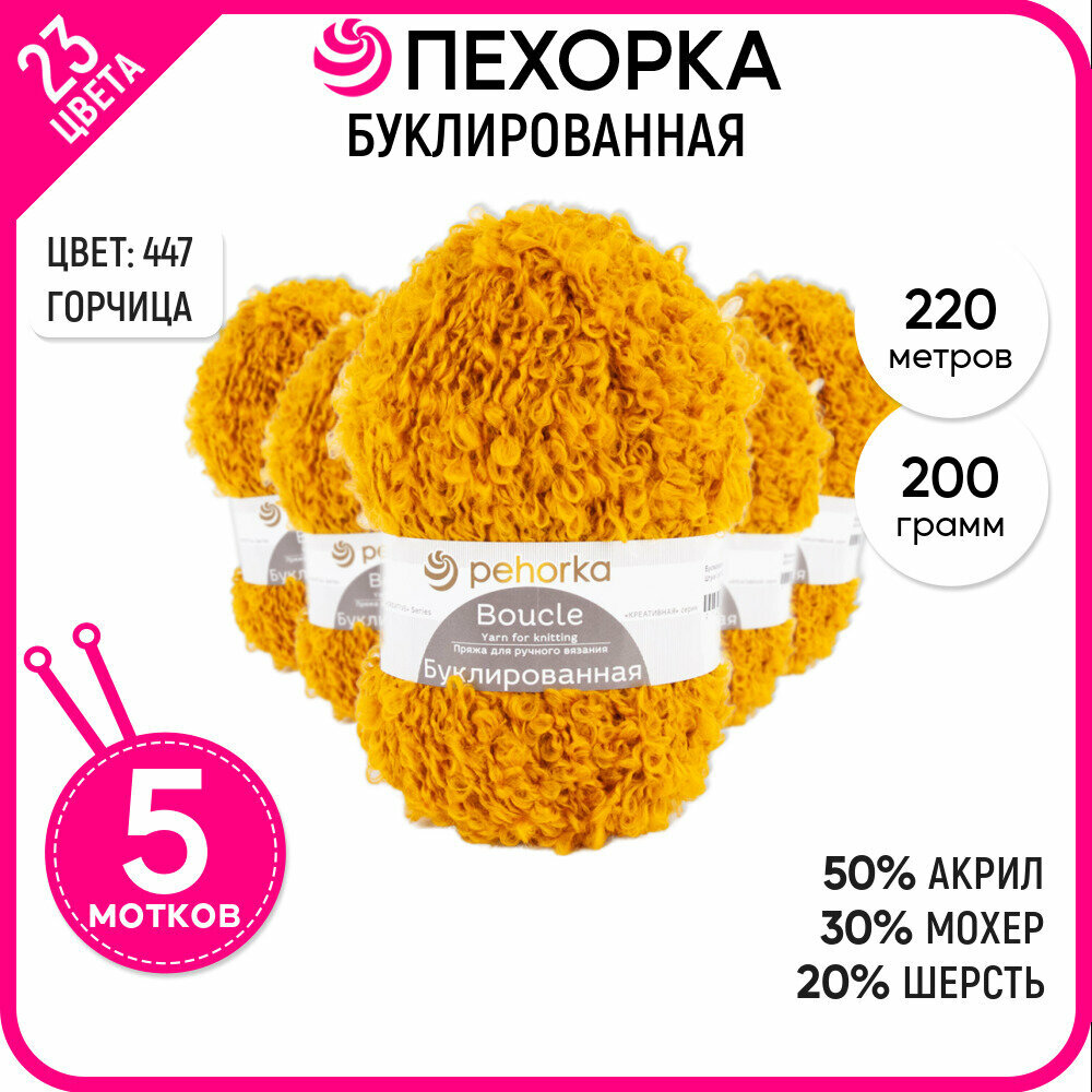Пряжа Пехорка Буклированная горчица (447), 30%мохер/20%шерсть/50%акрил, 220м, 200г, 5шт
