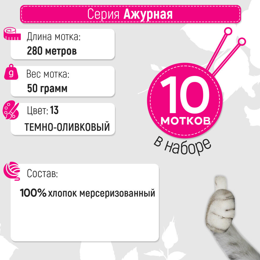 Ниже Вы можете прочитать отзывы на Пряжа для вязания Пехорка "Ажурная" 10 шт, Темно-оливковый №13, ознакомится с подробными характеристиками, посмотреть интересные обзоры и фотографии на Пряжа для вязания Пехорка "Ажурная" 10 шт, Темно-оливковый №13.