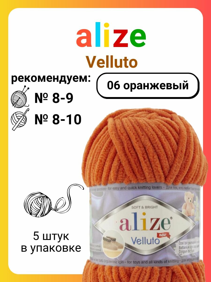 Пряжа для вязания плюшевая Alize Velluto, цвет 06 оранжевый, 100г, 68м, 5шт/упак