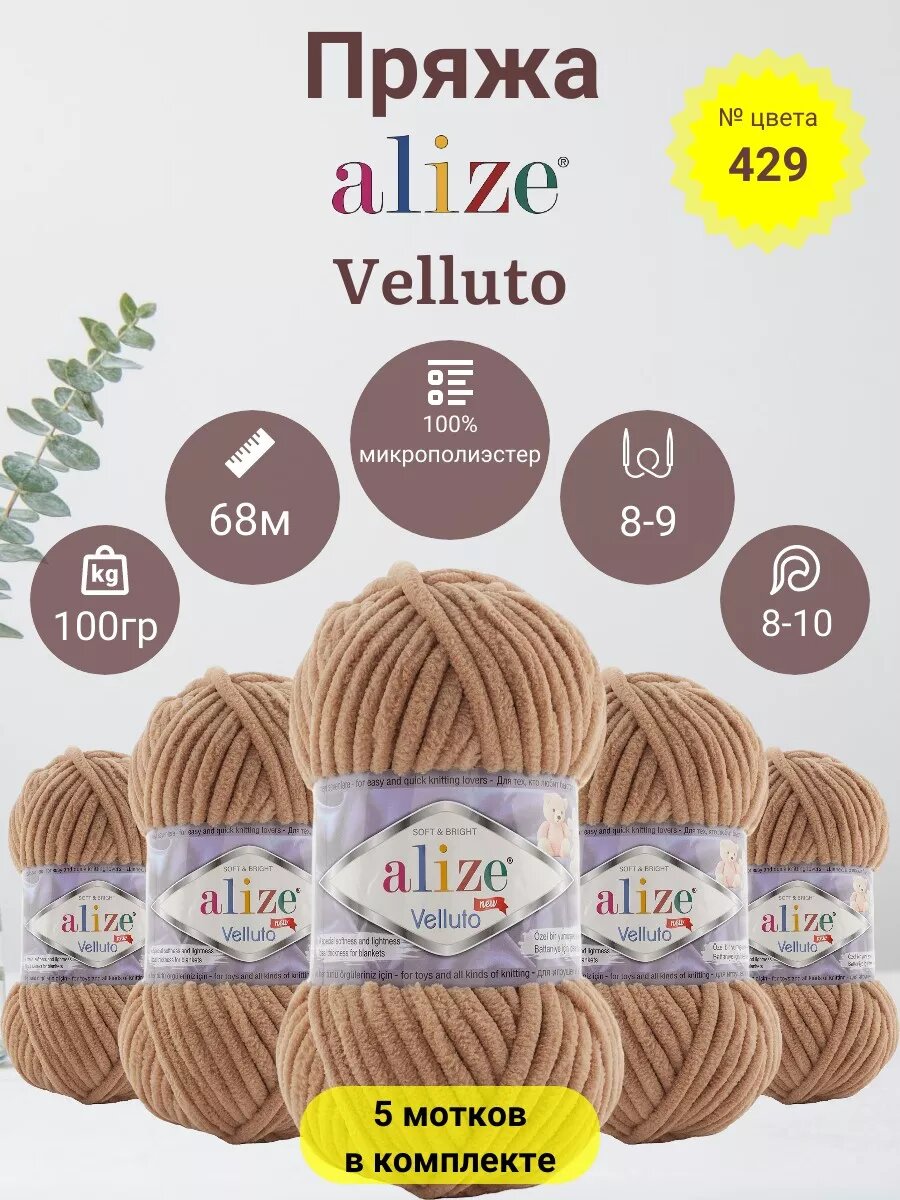Пряжа для вязания плюшевая Alize Velluto, цвет 429 верблюжий, 100г, 68м, 5шт/упак
