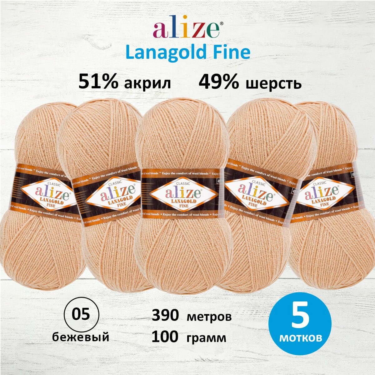 Купить Пряжа для вязания ALIZE LANAGOLD FINE: 5 (бежевый), 5 шт 390 м 100 г, 49% шерсть 51% акрил