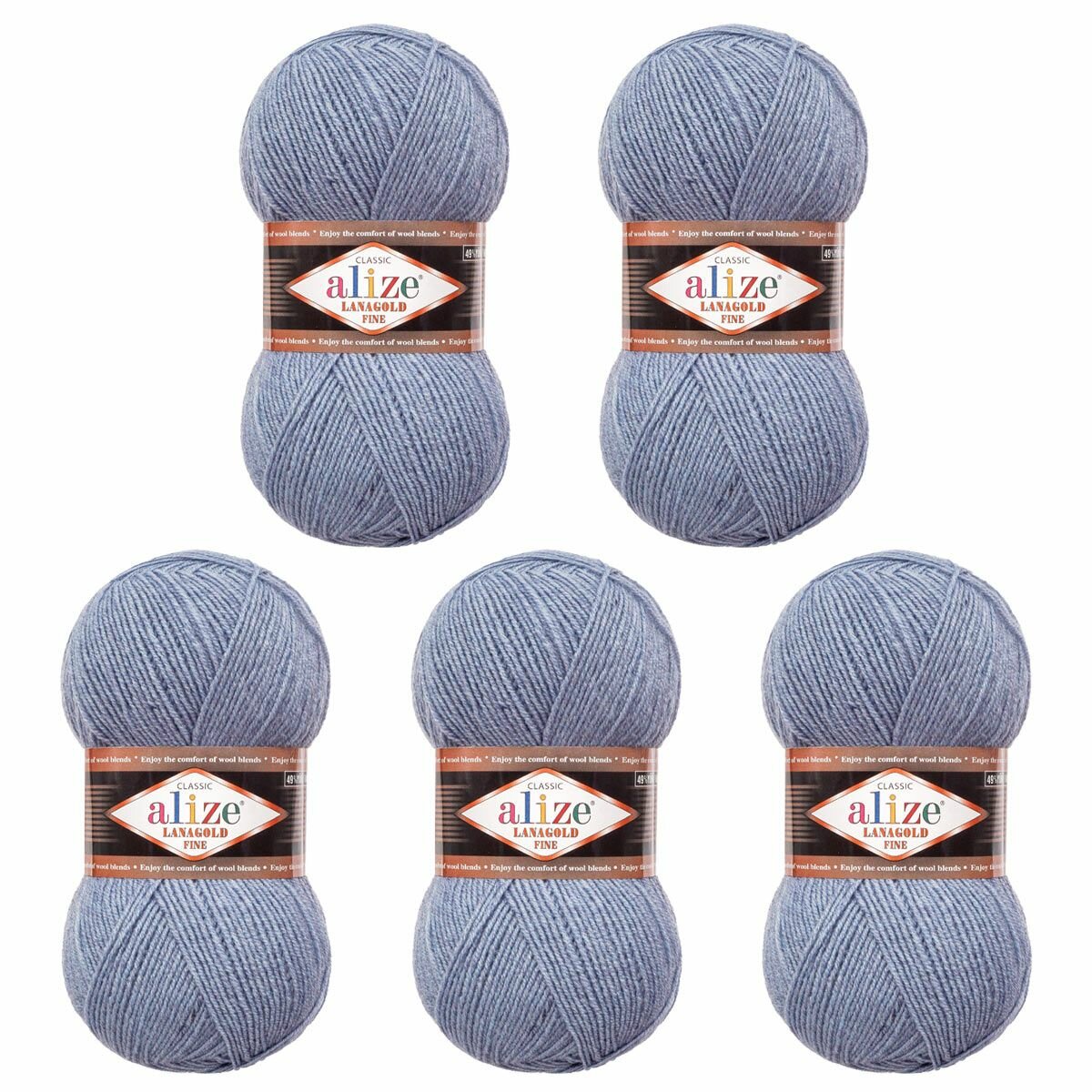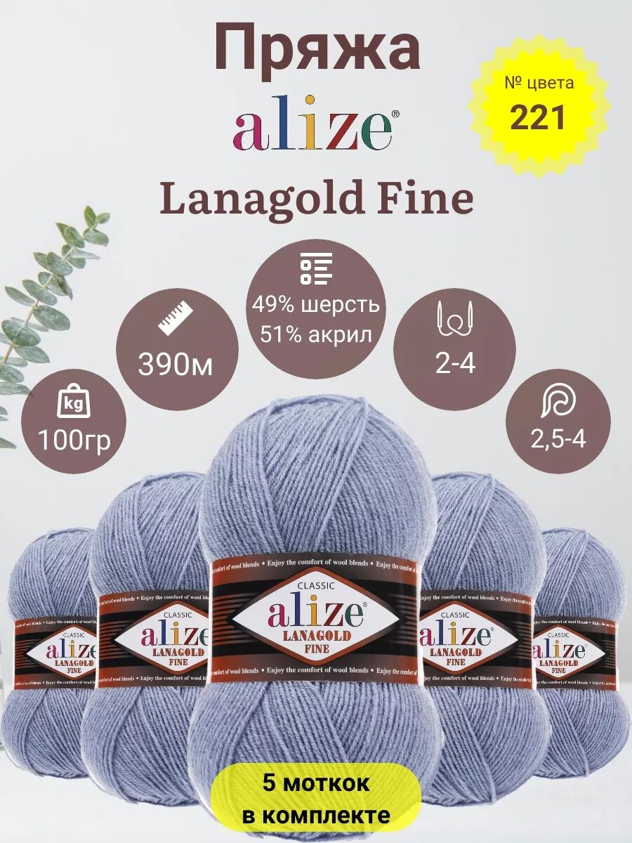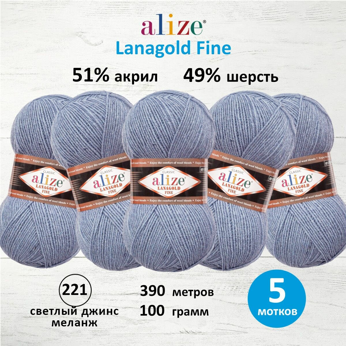 Пряжа Alize Lanagold Fine (Ализе Ланаголд Файн) - 5 мотков, 221 светлый джинс, 49% шерсть, 51% акрил 390м/100г