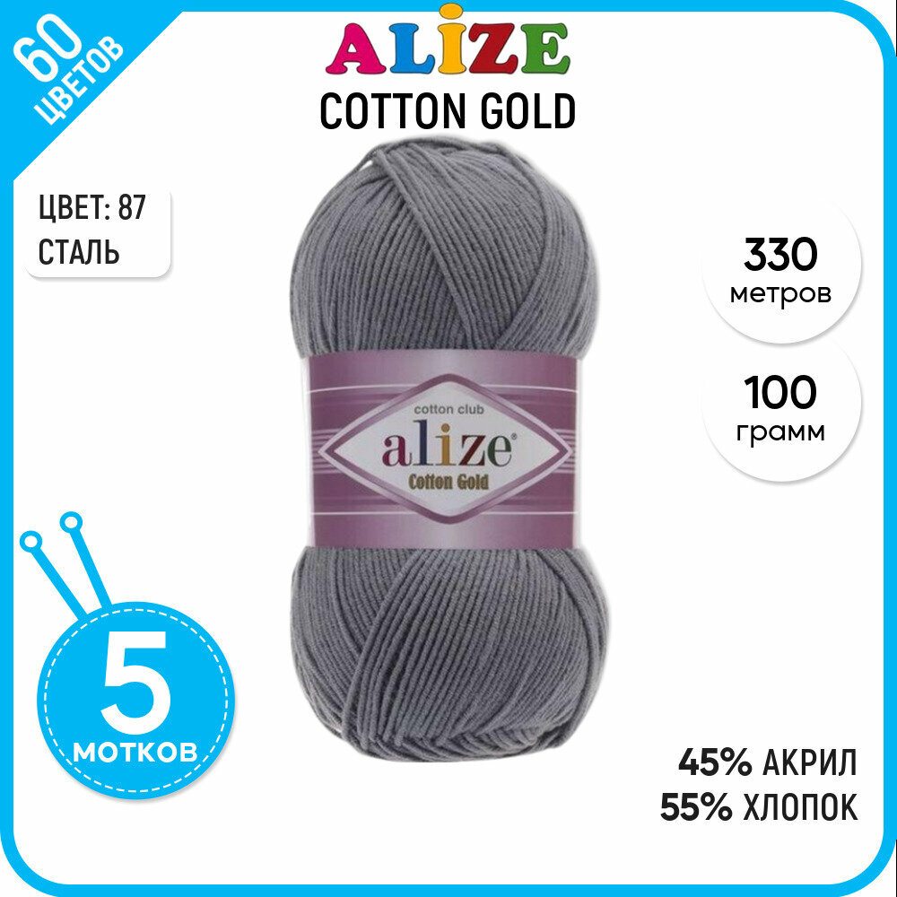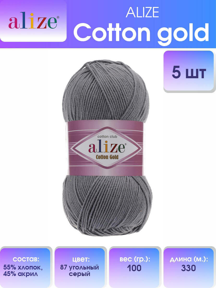 Купить Пряжа ALIZE Cotton gold, угольный серый - 87, 55% хлопок, 45% акрил, 5 мотков, 100 г., 330 м.