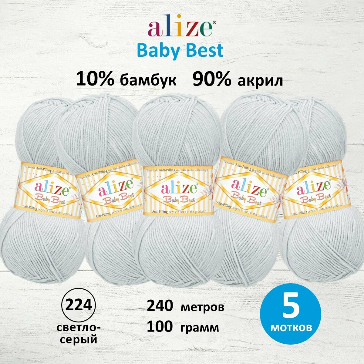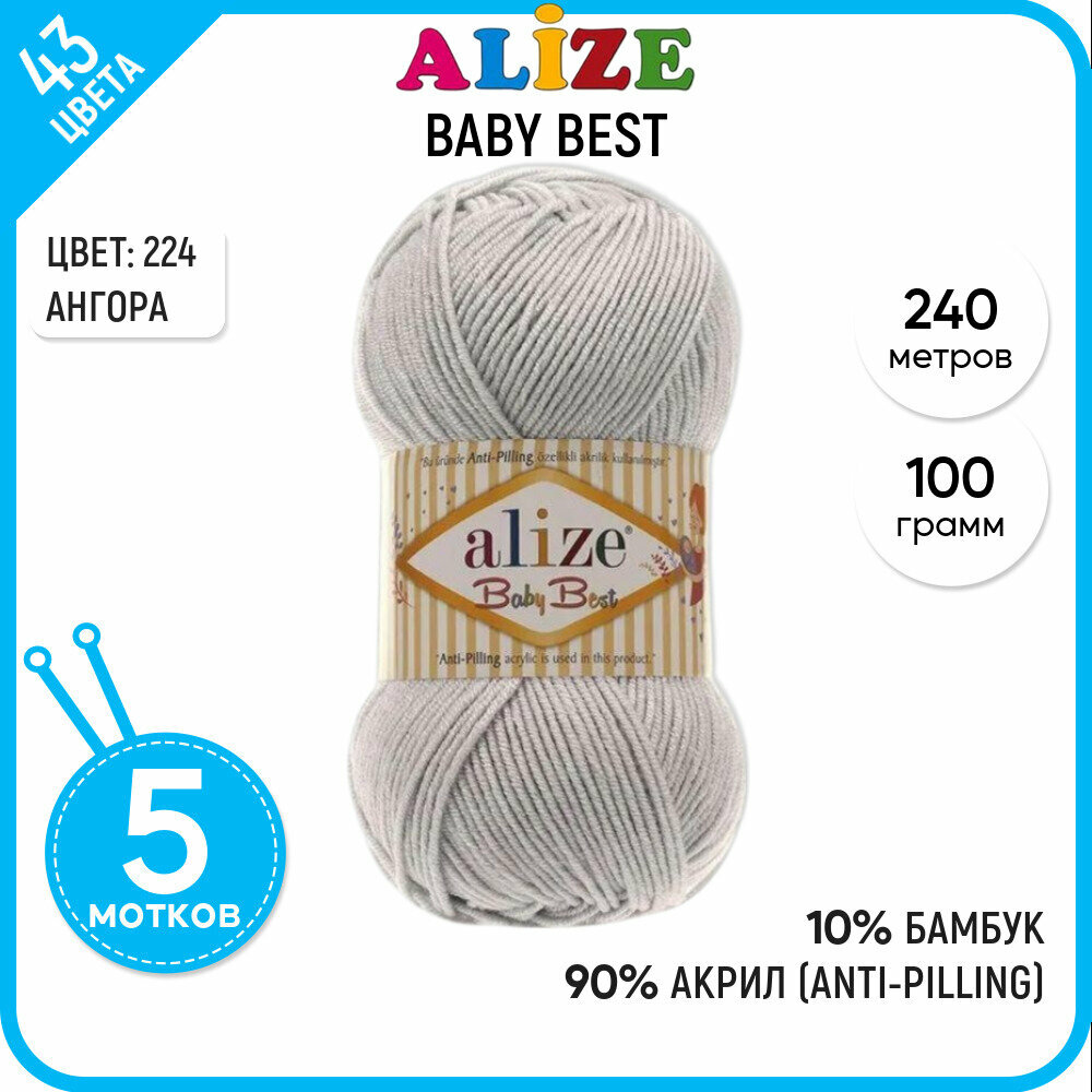 Пряжа BABY BEST (Alize), св. серый - 224, 10% бамбук, 90% акрил, 5 мотков, 100 г, 240 м.
