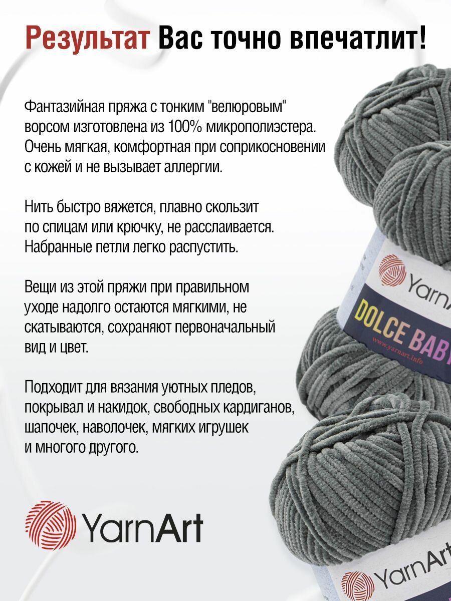 Ниже Вы можете прочитать отзывы на Пряжа для вязания YarnArt 'Dolce Baby' 50г, 85м (100% микрополиэстер) (760 серый), 5 мотков, ознакомится с подробными характеристиками, посмотреть интересные обзоры и фотографии на Пряжа для вязания YarnArt 'Dolce Baby' 50г, 85м (100% микрополиэстер) (760 серый), 5 мотков.