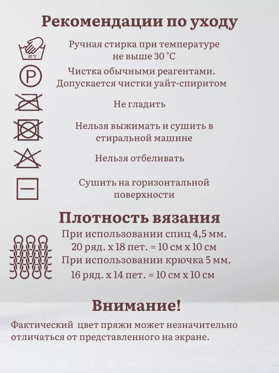| Плотность вязания для образца 10х10 см | 20 рядов х 18 петель спицы 4.5, 16 рядов Х 14 петель крючок 5 |