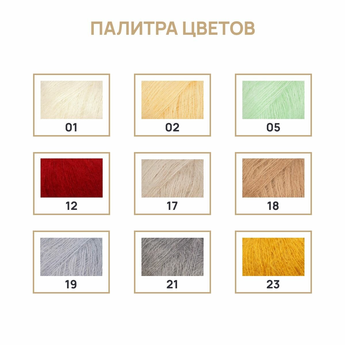 | Цвет товара | 01 белый, 02 лимонный, 05 мятный, 12 красный, 17 светлый бежевый, 18 карамель, 19 светлая лаванда, 21 дымчато-серый, 23 горчичный, 29 зеленый, 32 розовый, 36 голубая бирюза, 38 бежево-серый, 40 нежно-розовый, 41 пудровый |