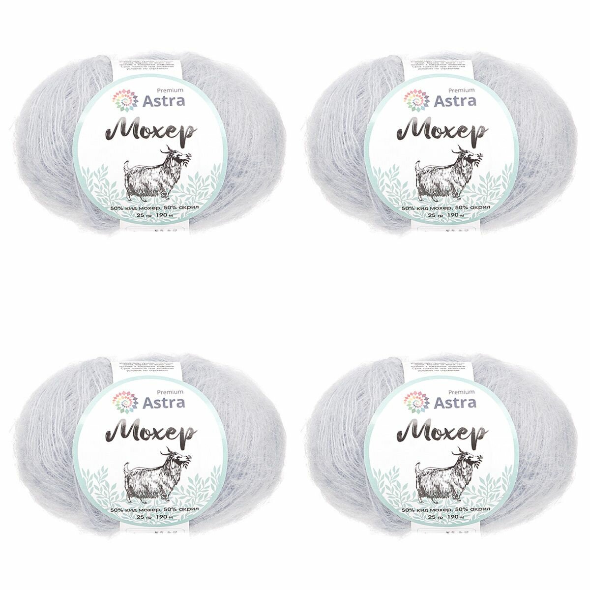 Пряжа для вязания Astra Premium 'Мохер' (Mohair) 25гр 190м (+/-5%) (50% кид мохер, 50% акрил) (01 белый), 4 мотка