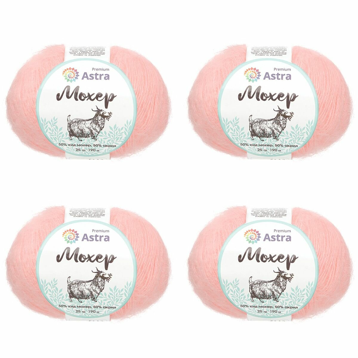 | Комплектация | Упаковка 4 штук Пряжа Astra Premium 'Мохер' (Mohair) 25гр 190м (+/-5%) (50% кид мохер, 50% акрил) (41 пудровый) |
