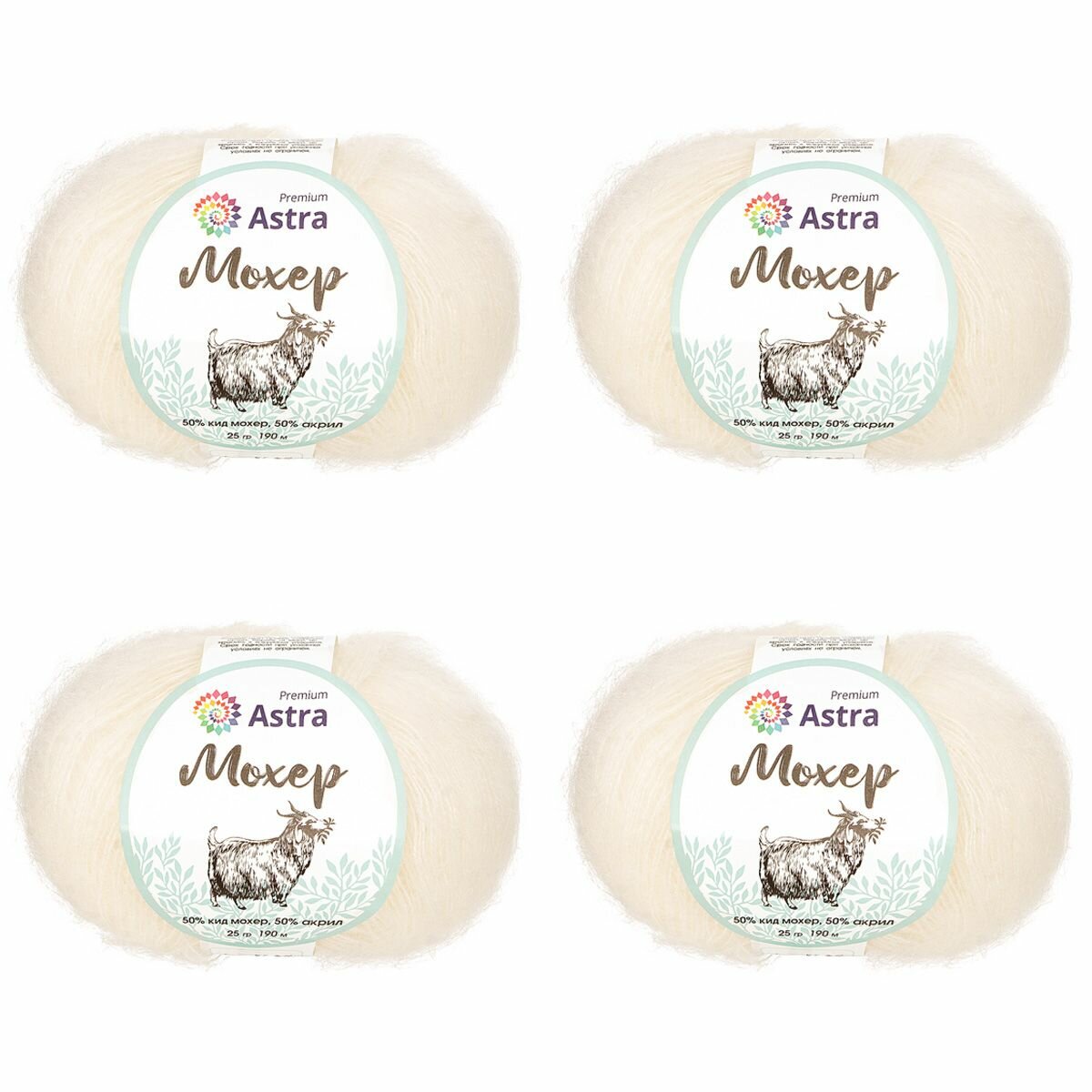 Пряжа для вязания Astra Premium 'Мохер' (Mohair) 25гр 190м (+/-5%) (50% кид мохер, 50% акрил) (01 белый), 4 мотка