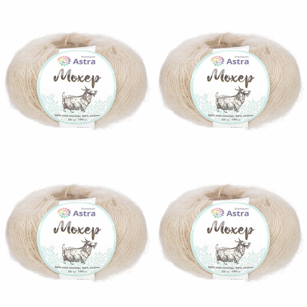 Пряжа для вязания Astra Premium 'Мохер' (Mohair), 25г, 190м (50% кид мохер, 50% акрил) (17 светлый беж), 4 мотка