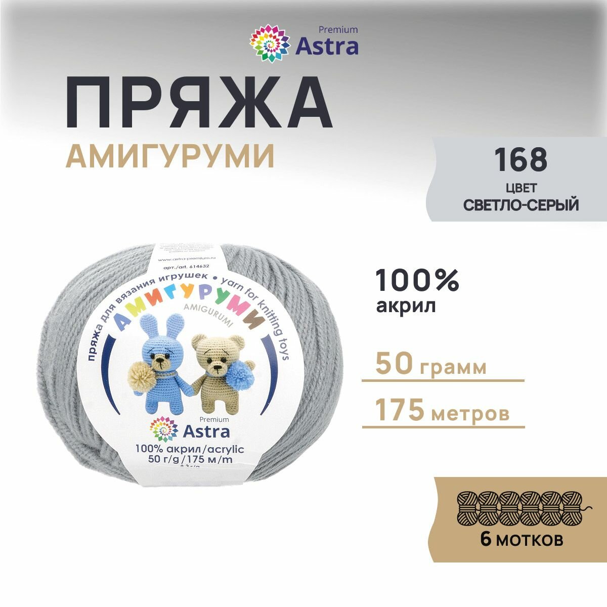 Пряжа для вязания Astra Premium 'Амигуруми', 50г, 175м (100% акрил) (168 светло-серый), 6 мотков