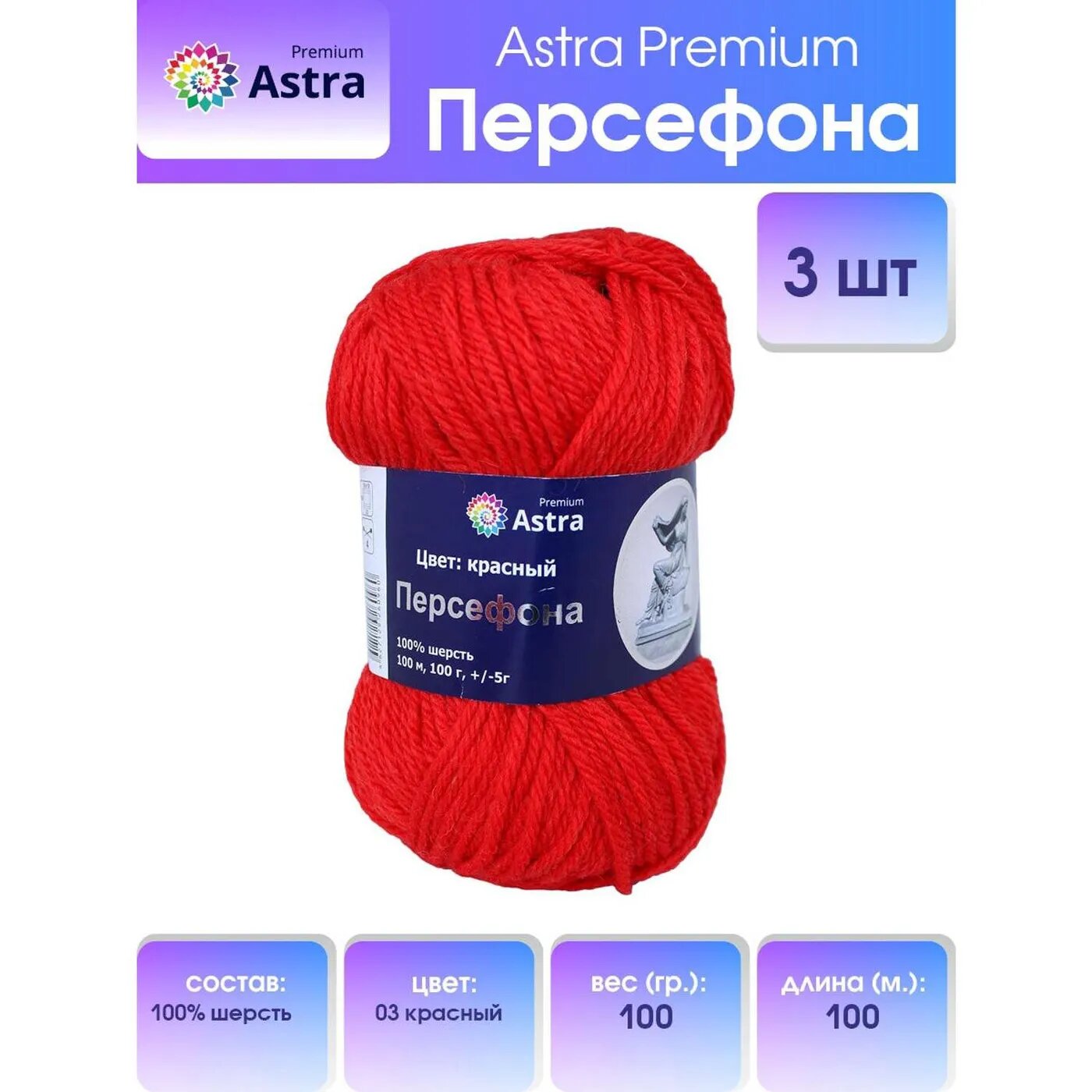 Пряжа для вязания Astra Premium 'Персефона', 100 г, 100 м (100% шерсть) (03 красный), 3 мотка
