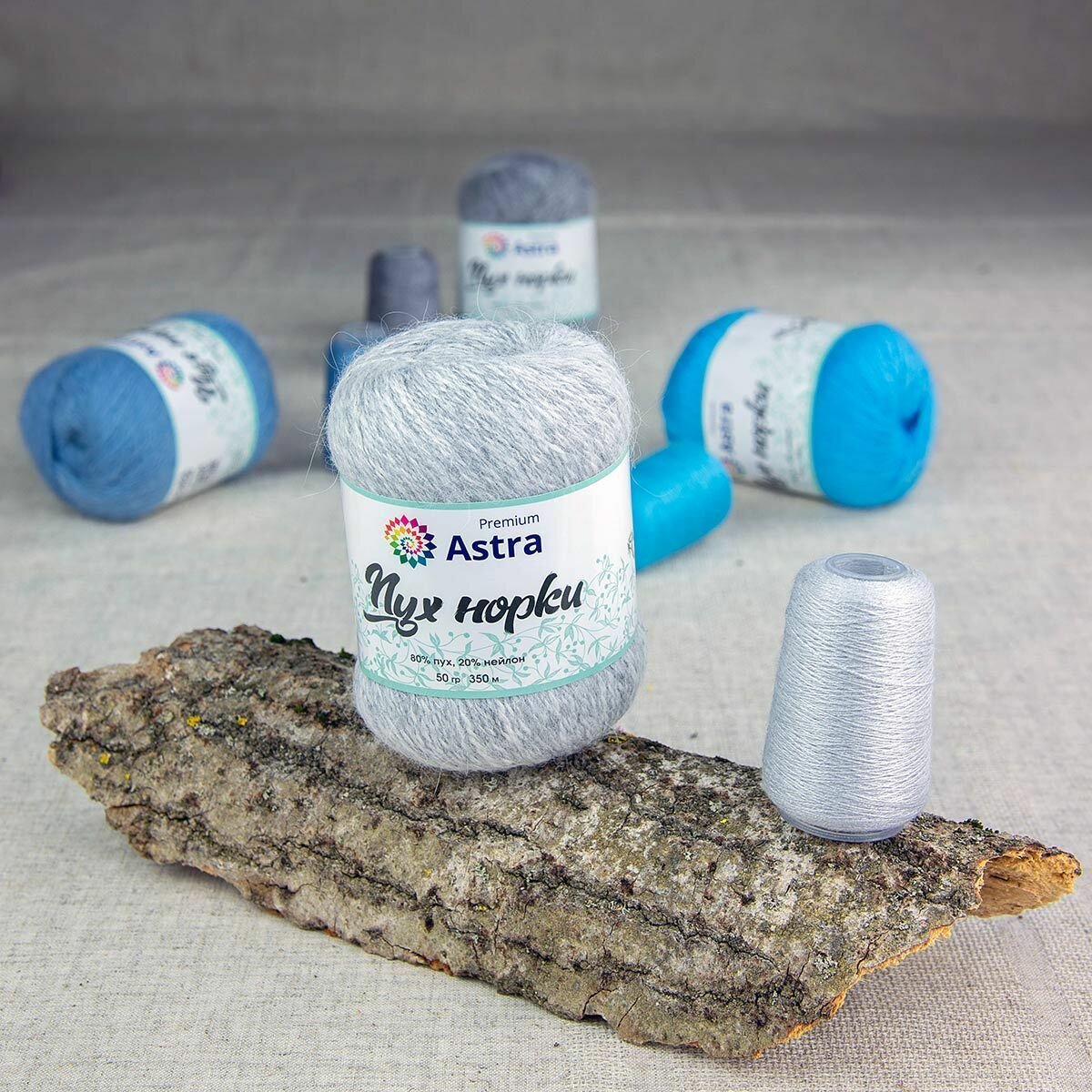 Пряжа для вязания Astra Premium 'Пух норки' (Mink yarn), 50г, 290м (80% пух, 20% нейлон) + нить 20г (064 серо-голубой)