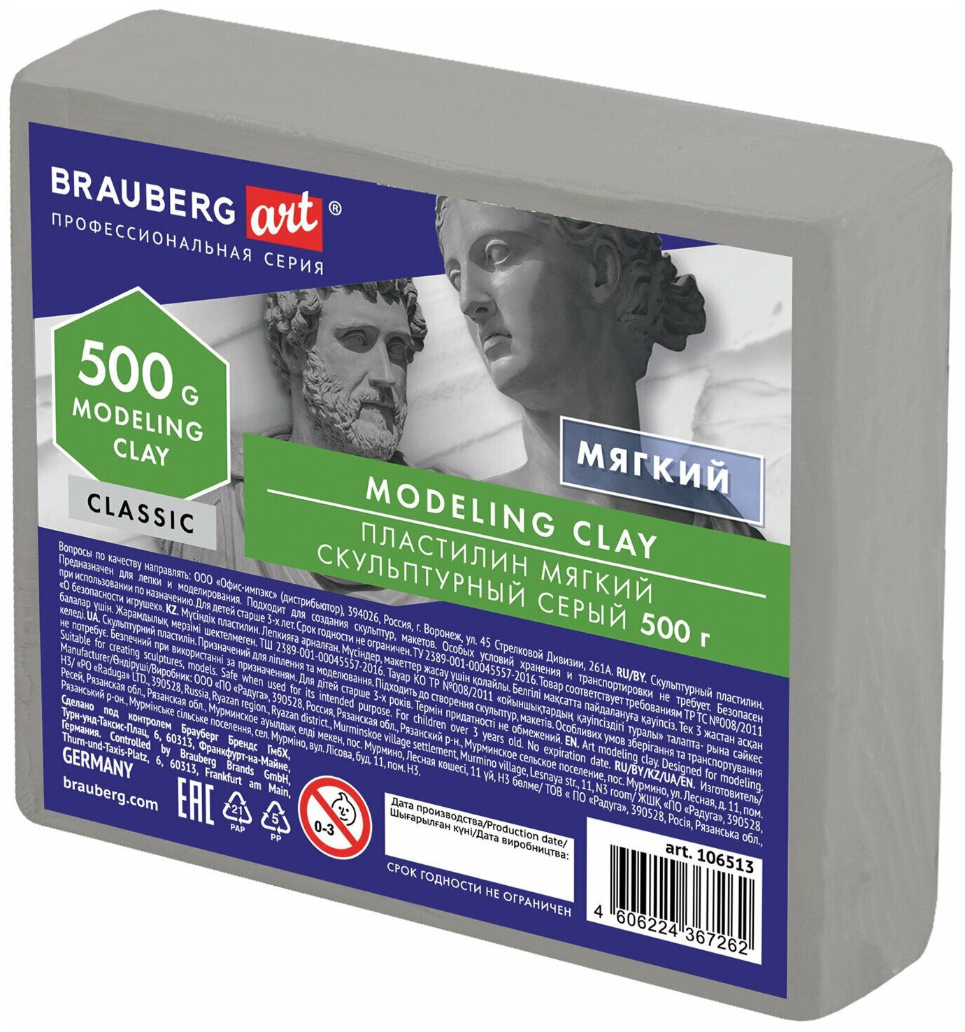 Купить Пластилин скульптурный BRAUBERG ART CLASSIC серый, 0,5кг, мягкий, 106513