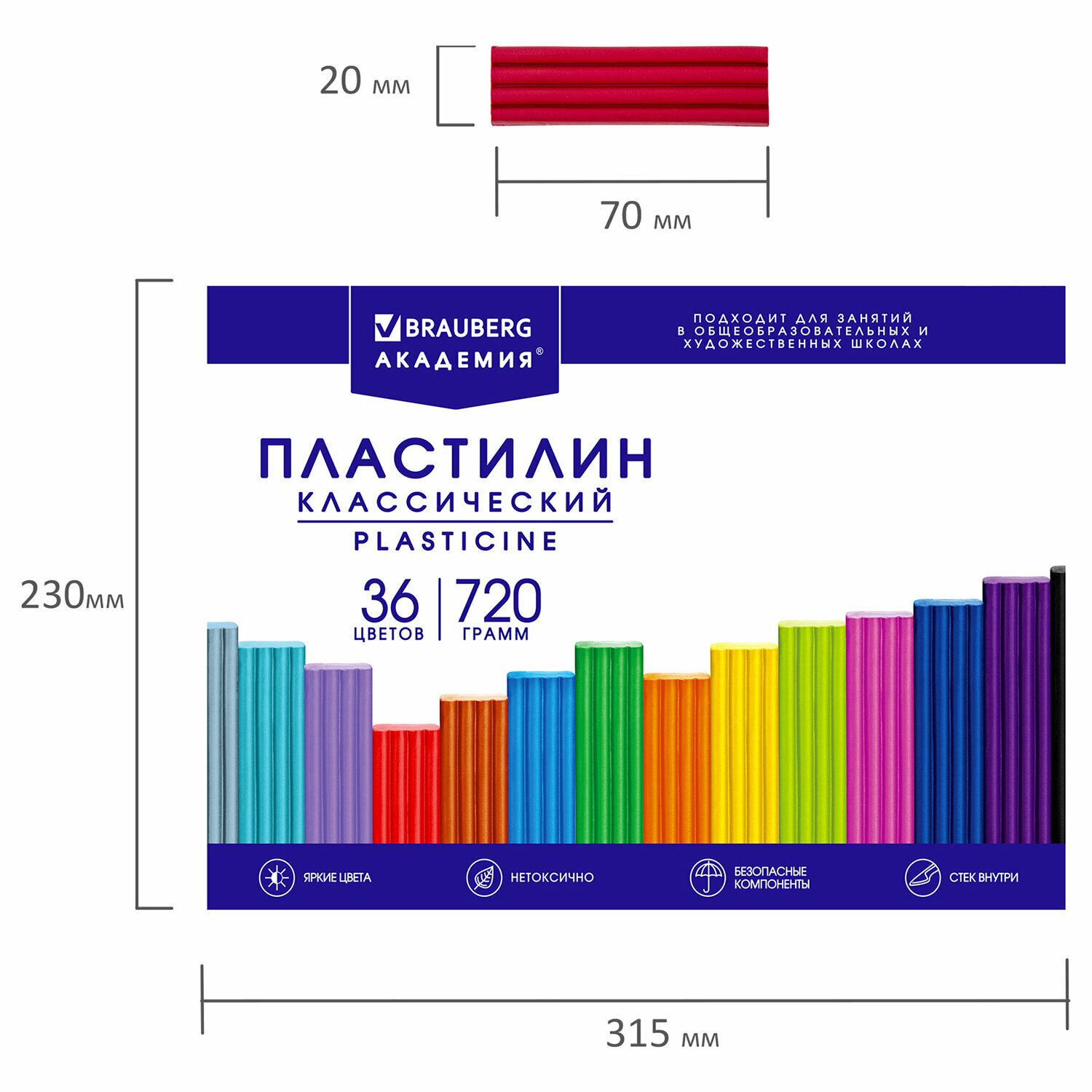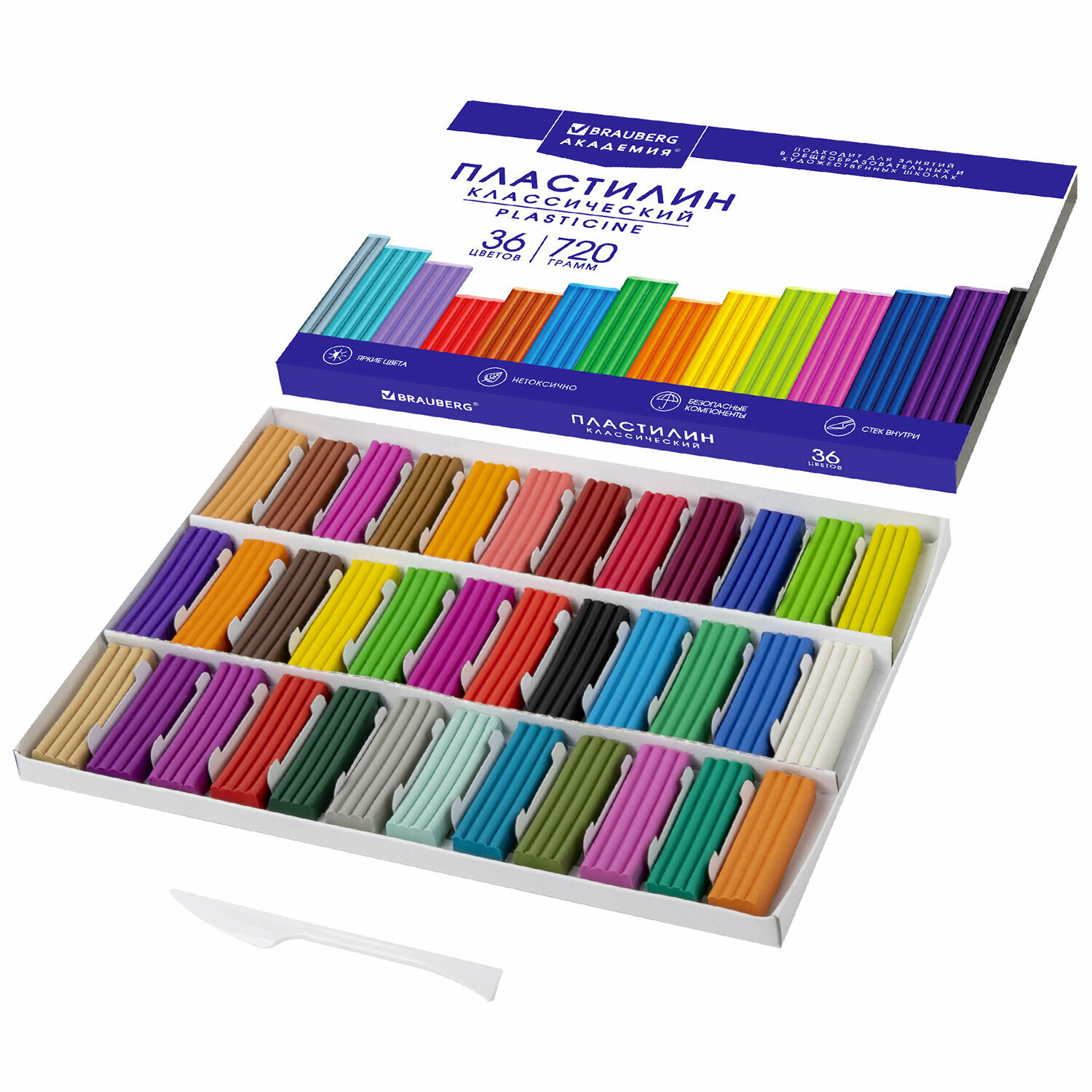 Пластилин классический BRAUBERG "академия классическая", 36 цветов, 720 г, стек, высшее качество, 106425
