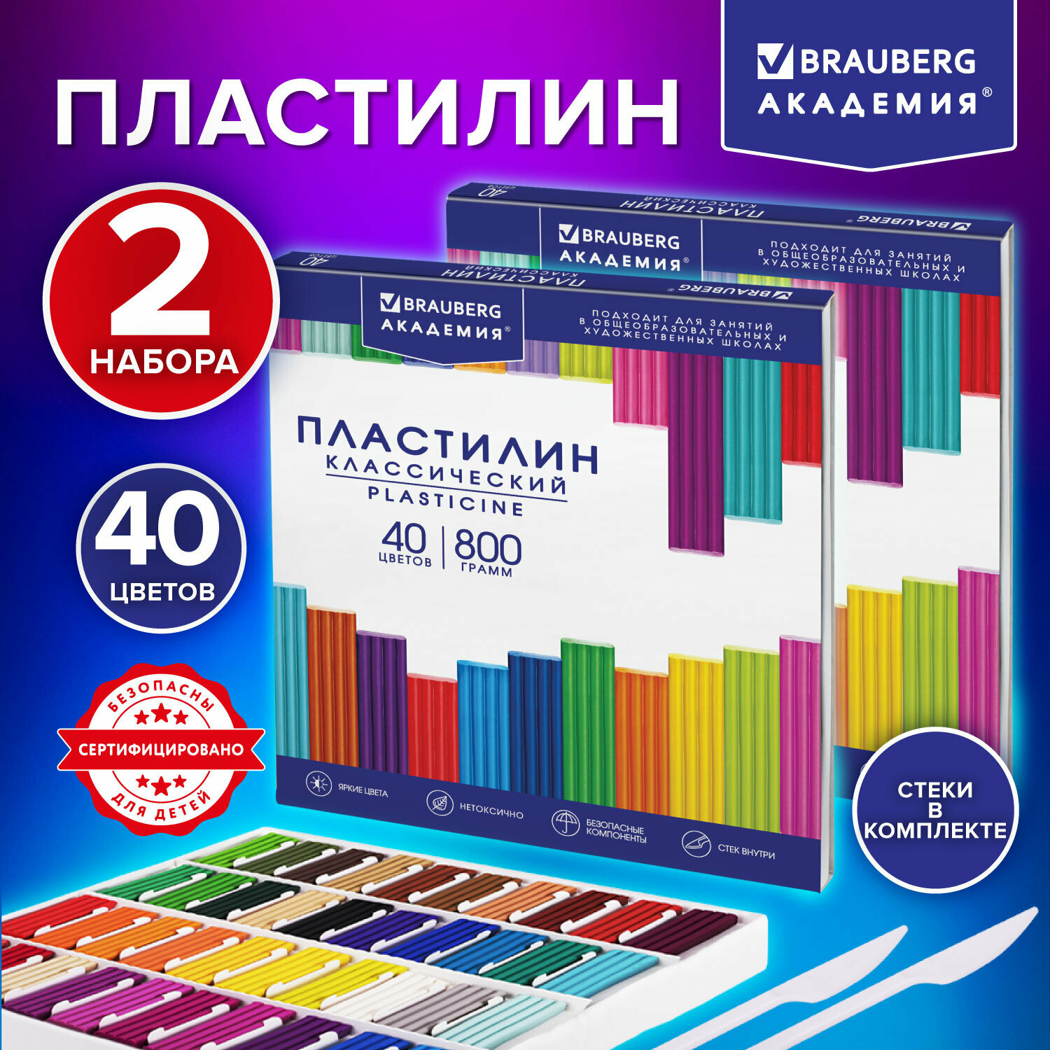 Купить Пластилин для лепки детский набор 2 штуки по 40 цветов большой, мягкий для малышей, классический в школу, 1600 грамм, 2 стека, Brauberg, 881062