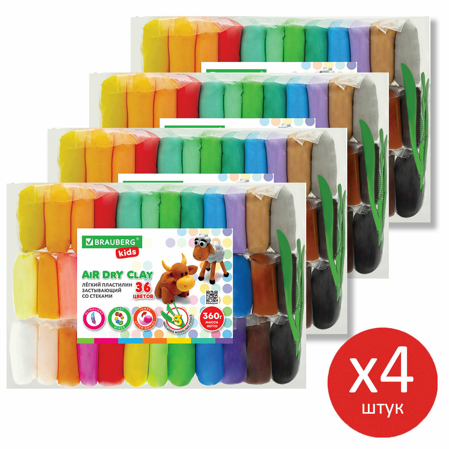 Купить Воздушный пластилин 4 набора для лепки 144 штуки, легкий мягкий детский, для малышей с 12 стеками застывающий, 1440 грамм, Brauberg Kids, 881051