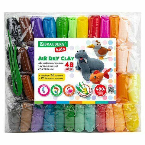 Пластилин Brauberg Kids, супер лёгкий, застывающий, 48 шт., 36 цветов + 12 базовых, 480 г., 3 стека
