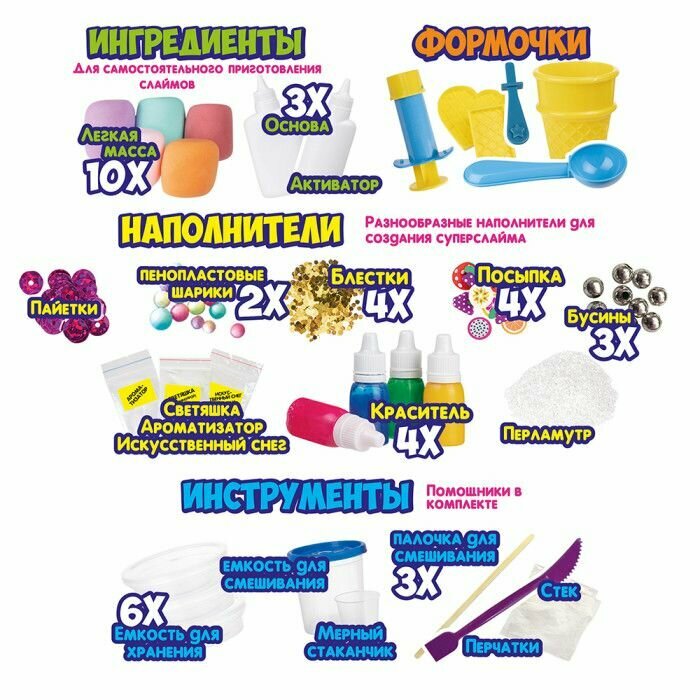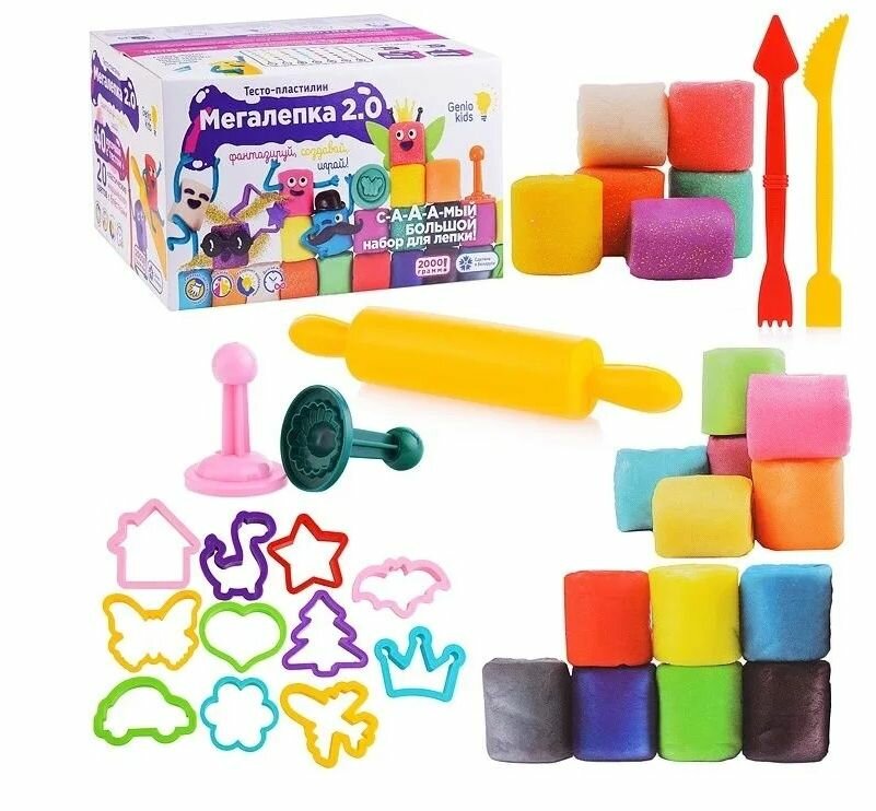 | Комплектация | 40 кусочков теста-пластилина по 50 г: 20 цветов (6 с блестками / 6 маршмеллоу / 8 классические) - всего 2000 г / 12 шт. формочки / 2 шт. штампик / 1 шт. скалка / 2 шт. стек / комплект аксессуаров "Создай персонажа" / 20 шт. пакетики для хранения. |