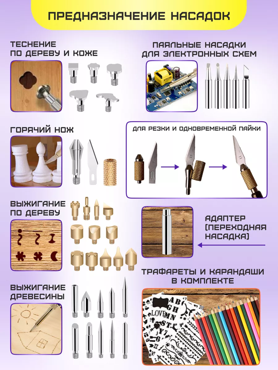 | Подробная комплектация | 40 насадок, подставка, трафареты - 7 шт, копировальная бумага 10 шт, кейс для хранения, карандаши - 18 шт, выжигательный аппарат |