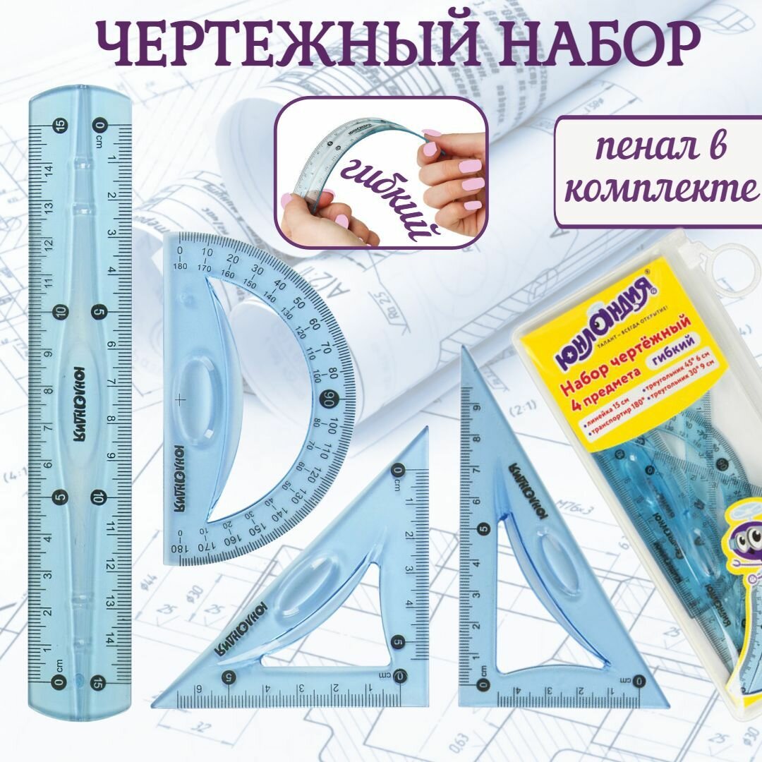 Набор чертежный Юнландия малый гибкий "FLEX" (линейка 15 см, 2 треугольника, транспортир), пенал