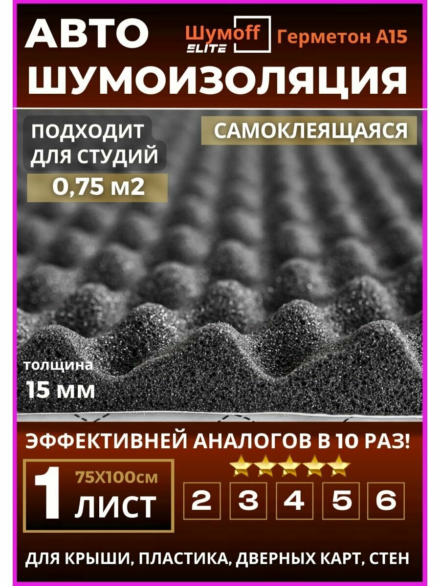 Акустический поролон Шумофф Герметон А15 - 3 листа. Шумоизоляция для автомобиля Шумоff 15 мм, шумка в авто, шумоизоляция дверей, дверных карт, крыши, потолка, пола, шумка в машину, звукоизоляция авто, акустика в машину