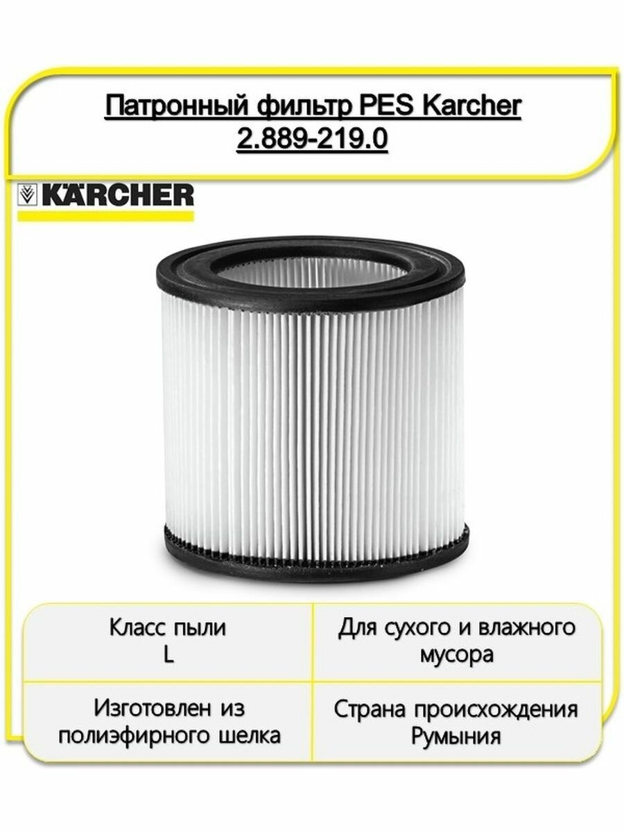 Фильтр для пылесоса Karcher (2.889-219.0) 22 л к модели NT 22/1 полиэфирный шелк патронный для сухой и влажной уборки интересное: