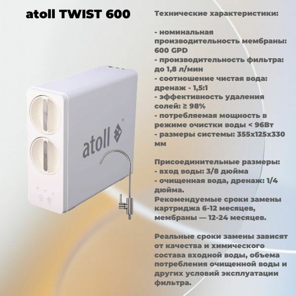 Прямоточный обратный осмос atoll TWIST 600 с индикатором срока замены картриджей