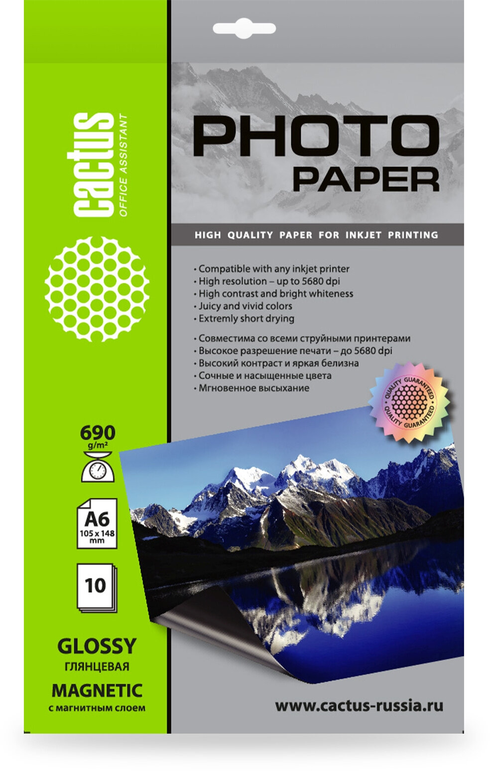 Фотобумага A6 690 г/м² глянцевое/магнитный, 10 листов, односторонняя Cactus (CS-MGA669010)