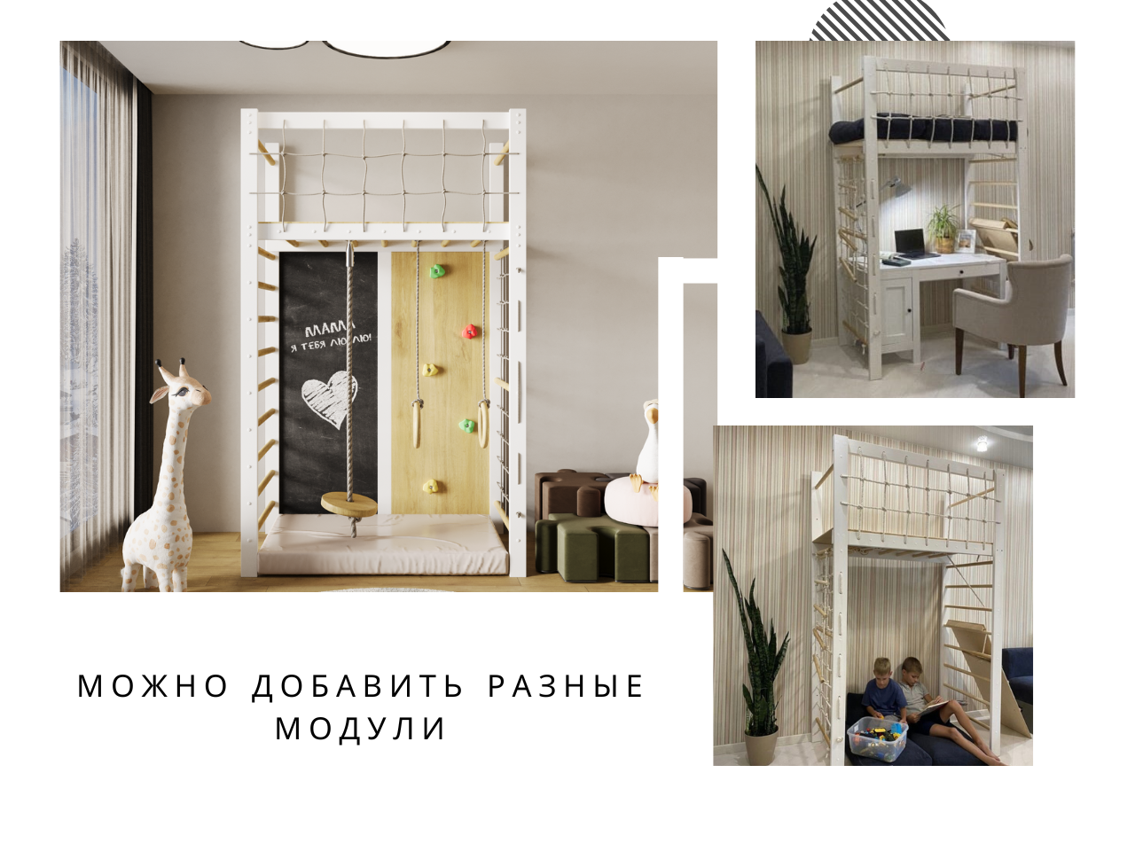| Комплектация | КОМПЛЕКТАЦИЯ: *Модуль "Шведская стенка" - 1шт. *Модуль "Сетка" - 1 шт *Второй этаж с настилом из 15 мм. березовой фанеры в/с *Защитная сетка на верхнем этаже * Рукоход - 1 шт. *Крепежи *Упаковка !МАТ В КОМПЛЕКТ НЕ ВХОДИТ! |