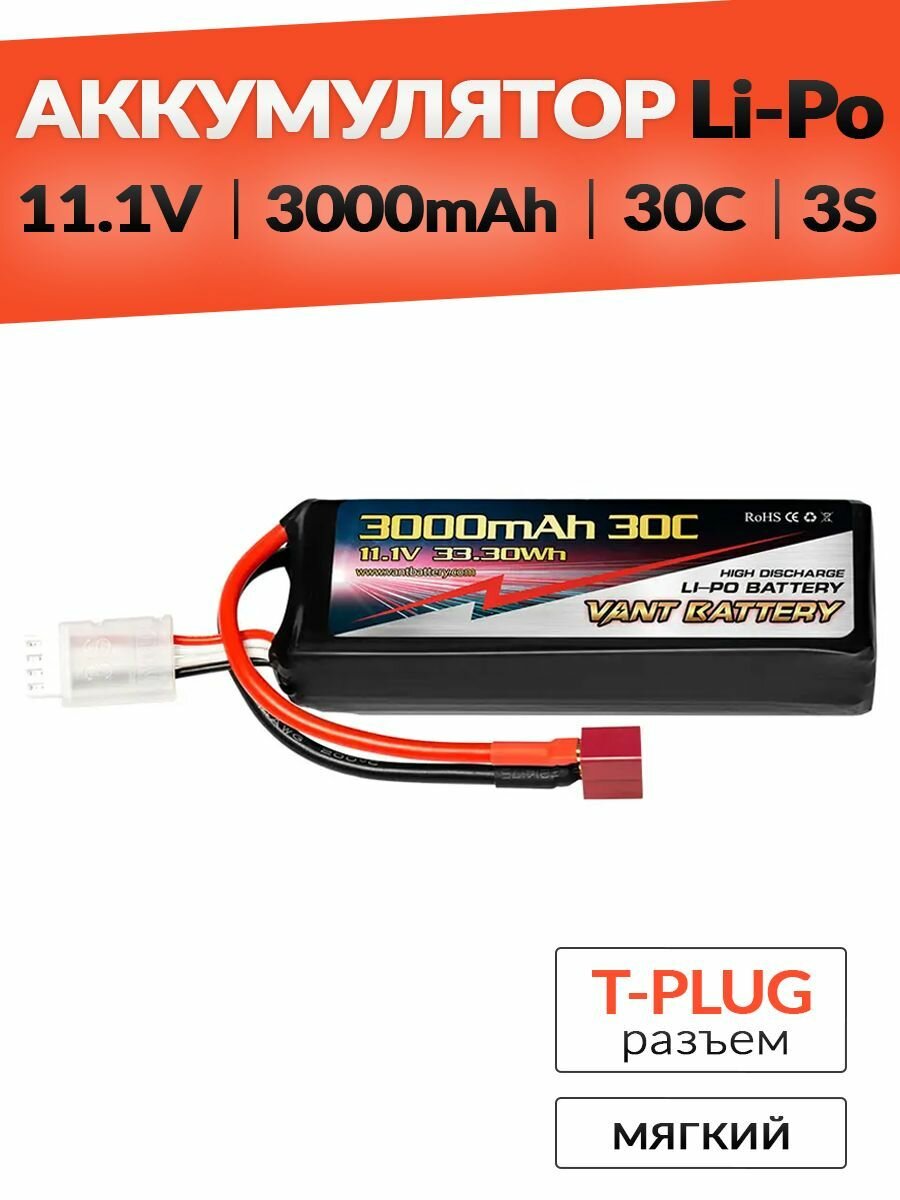 Купить Аккумулятор Vant LiPo 11.1V 3000mAh 30C, разъем T-Plug, для радиоуправляемых вертолетов, катеров, машин