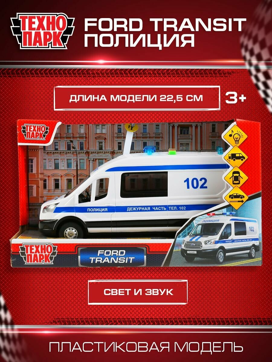 Купить Машинка детская Ford Transit Полиция 22.5 см, Технопарк, пластик, открываются двери и кузов, свет и звук