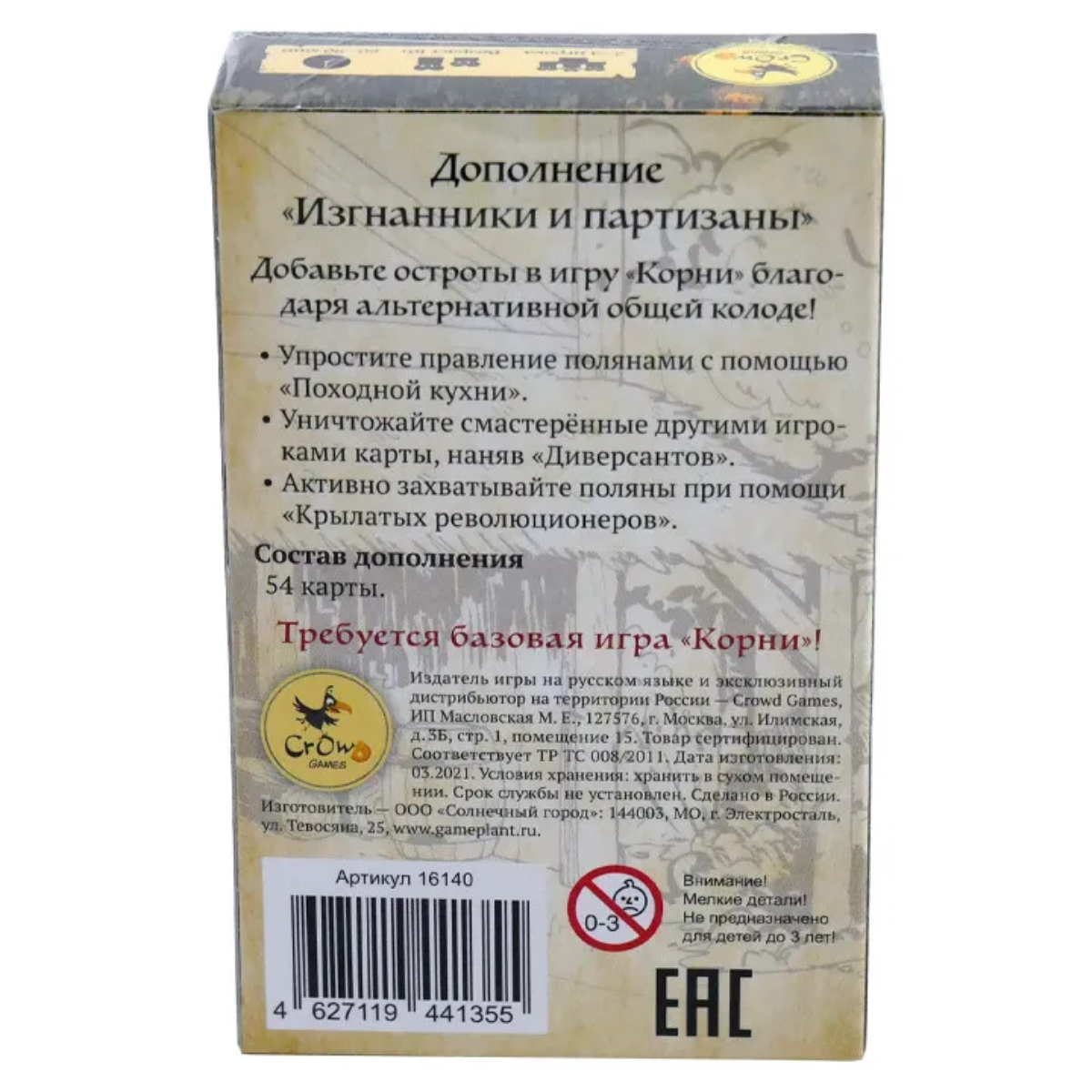 | Дополнительная информация | размер карт: 63 × 88 мм; не является самостоятельной игрой, позволяет расширить функционал базовой игры Корни (приобретается отдельно) |